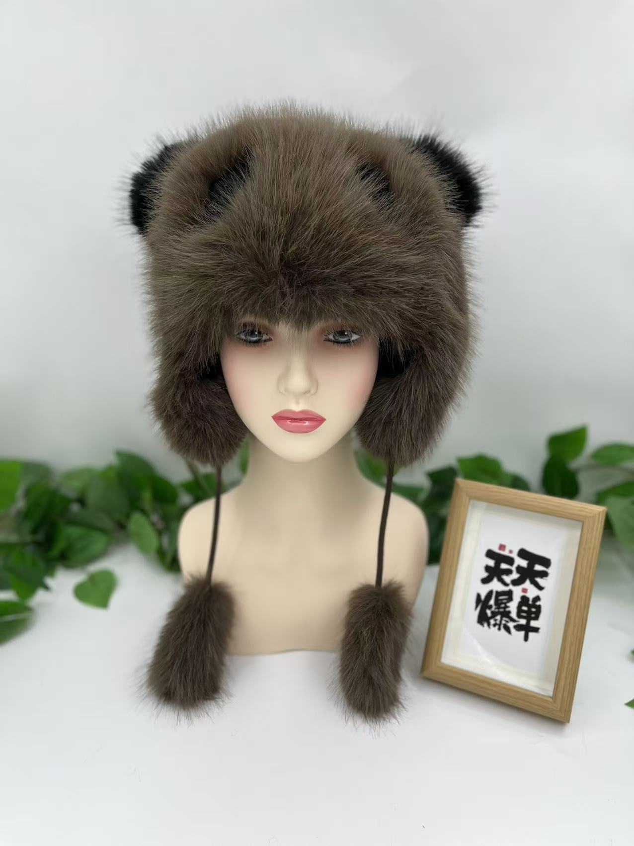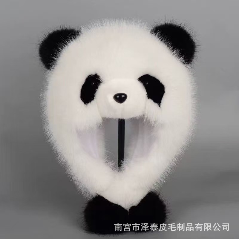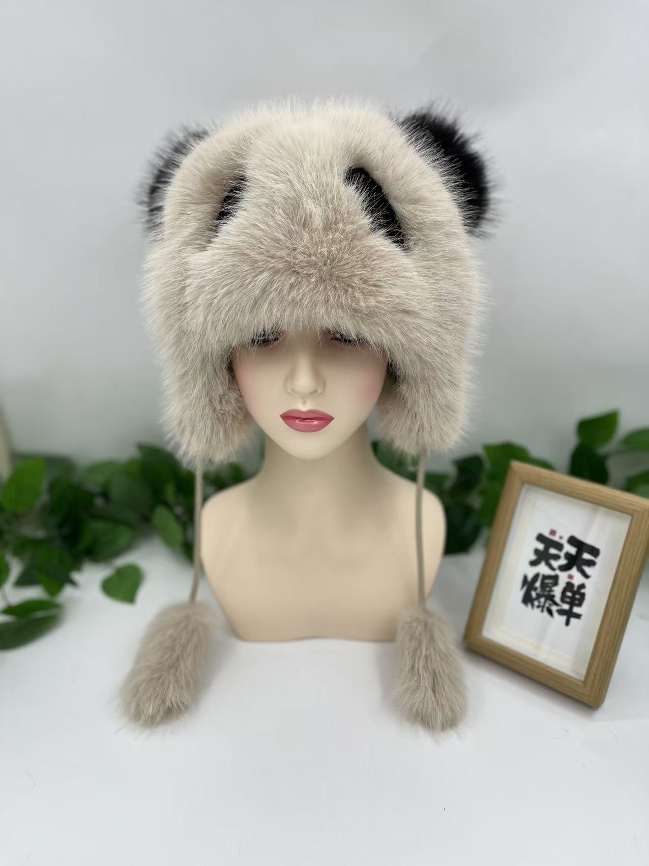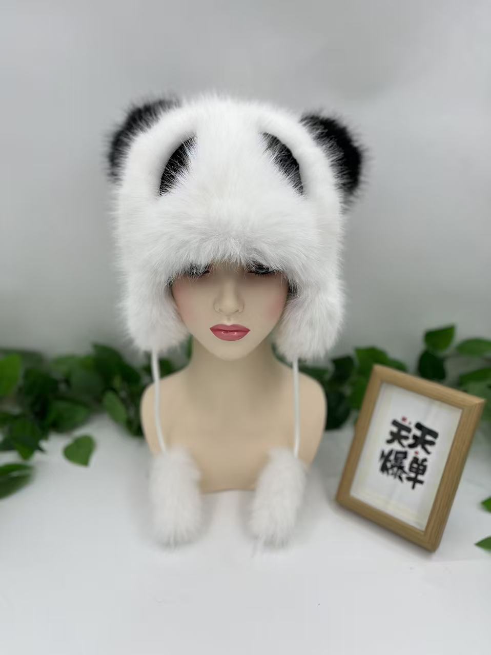 新款熊猫毛绒帽时尚保暖成人冬季潮帽显脸小护耳卡通加厚仿狐时髦