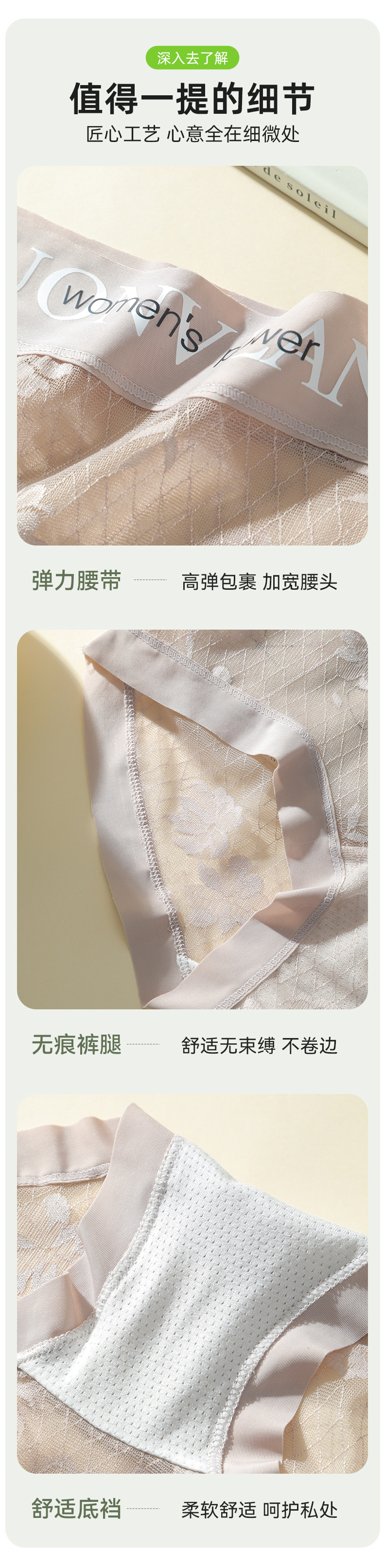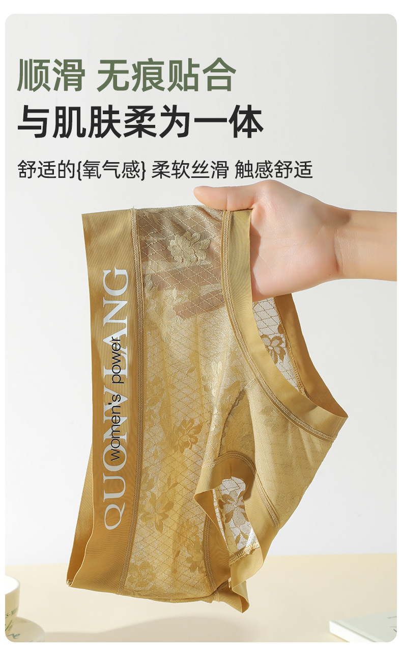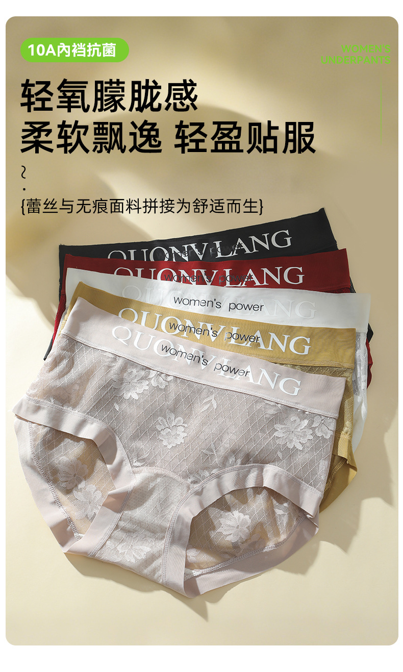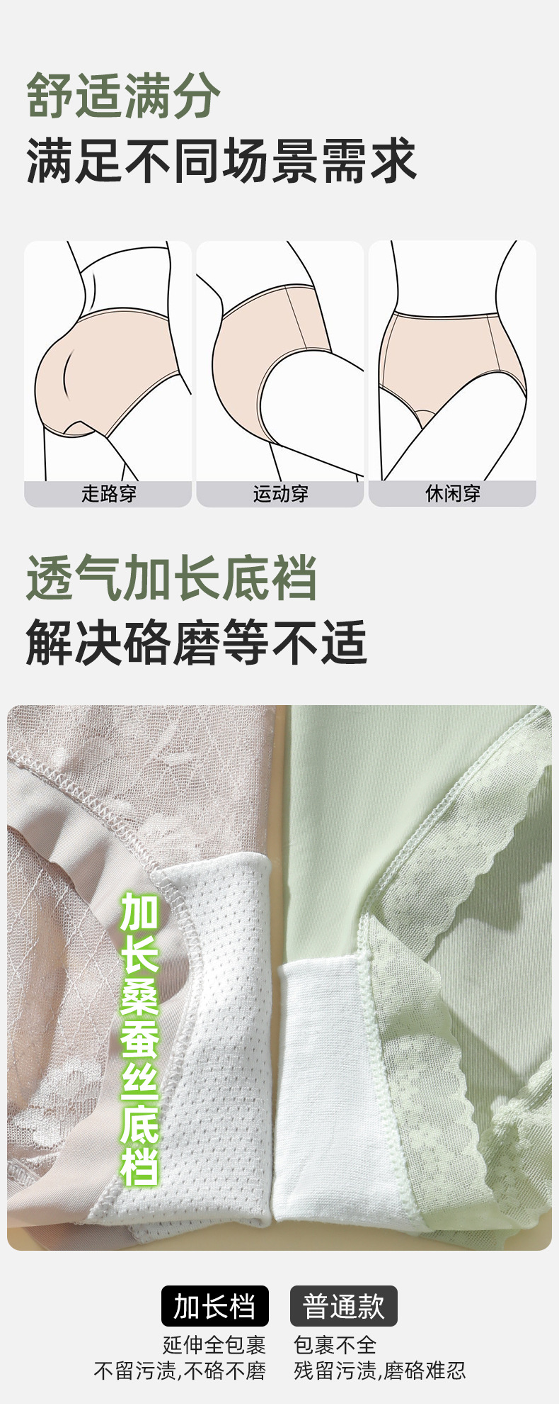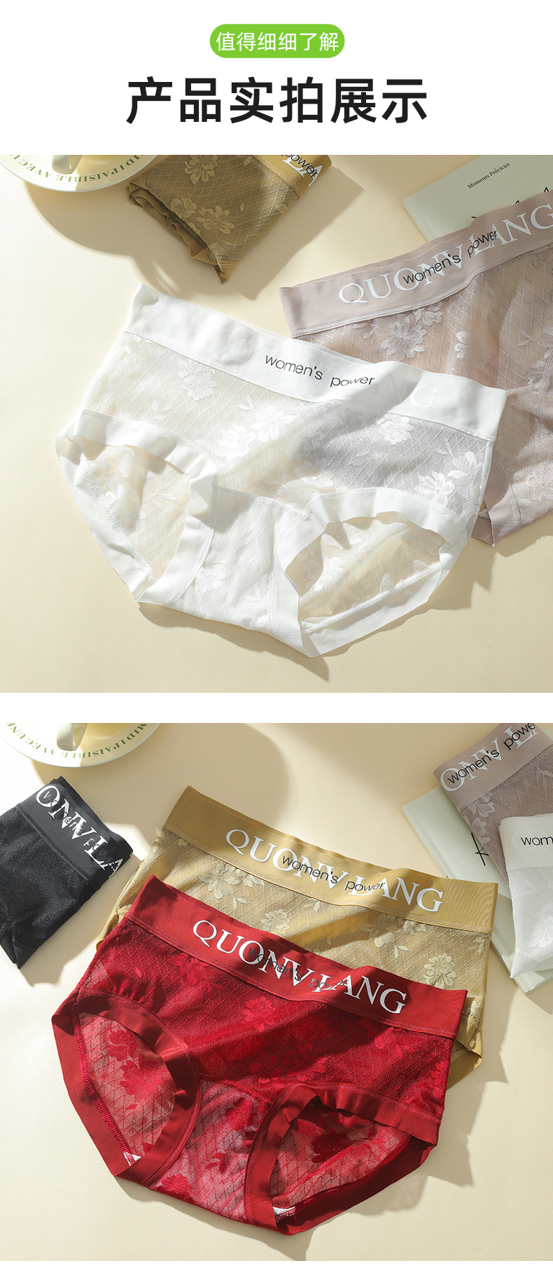 中腰蕾丝女士内裤透气薄款裸感舒适10A抗菌桑蚕丝裆加长裆内裤女