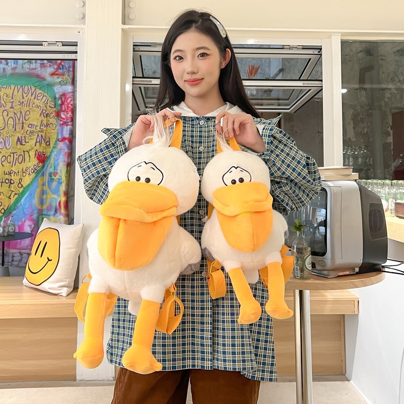 新商品のペリカンのぬいぐるみは学生の小さいリュックサックを包んで醜いです。