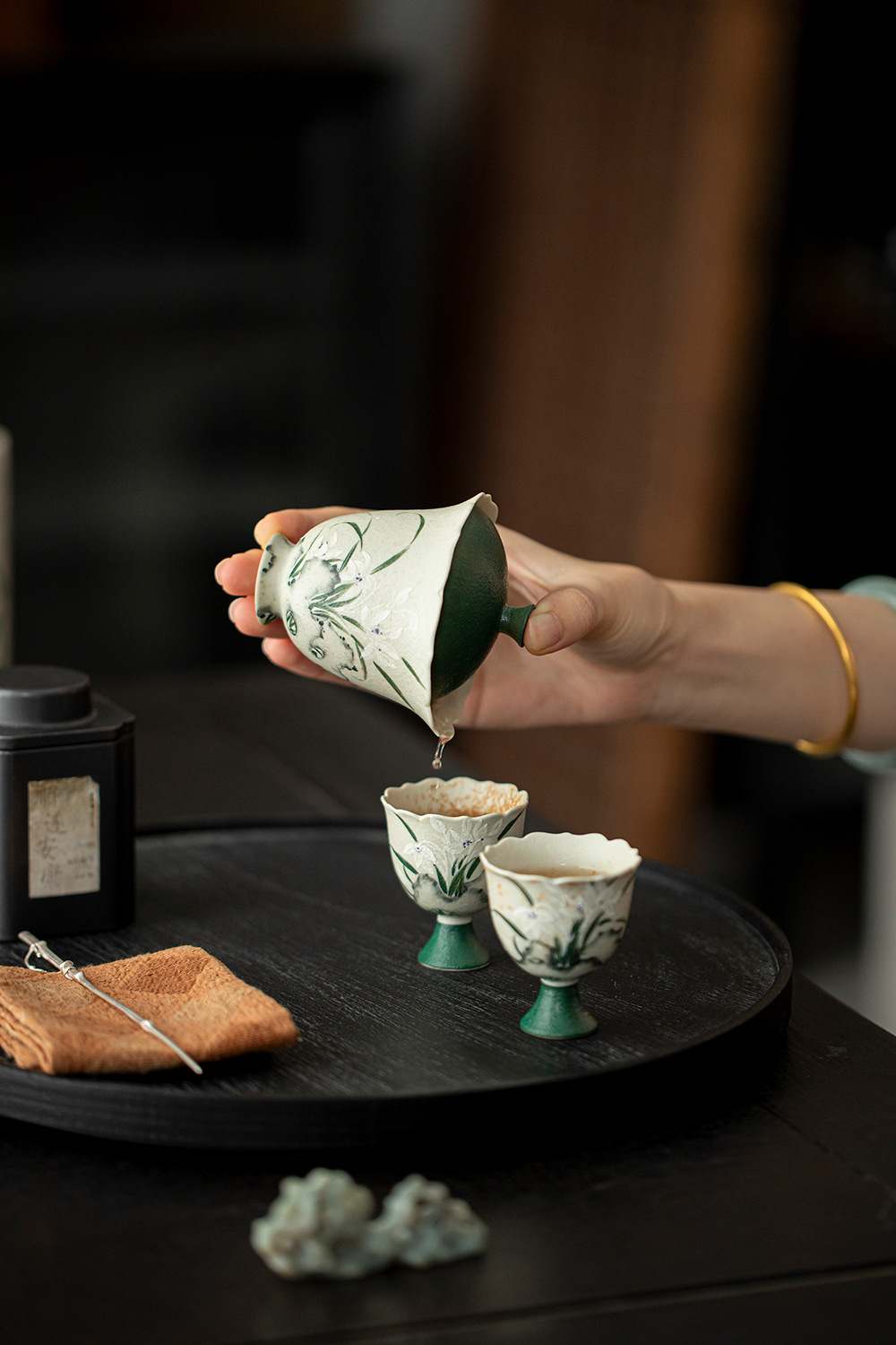 墨己越窯青磁器花口品茗杯耀州窯花型茶単杯陶磁器聚香杯トランペット