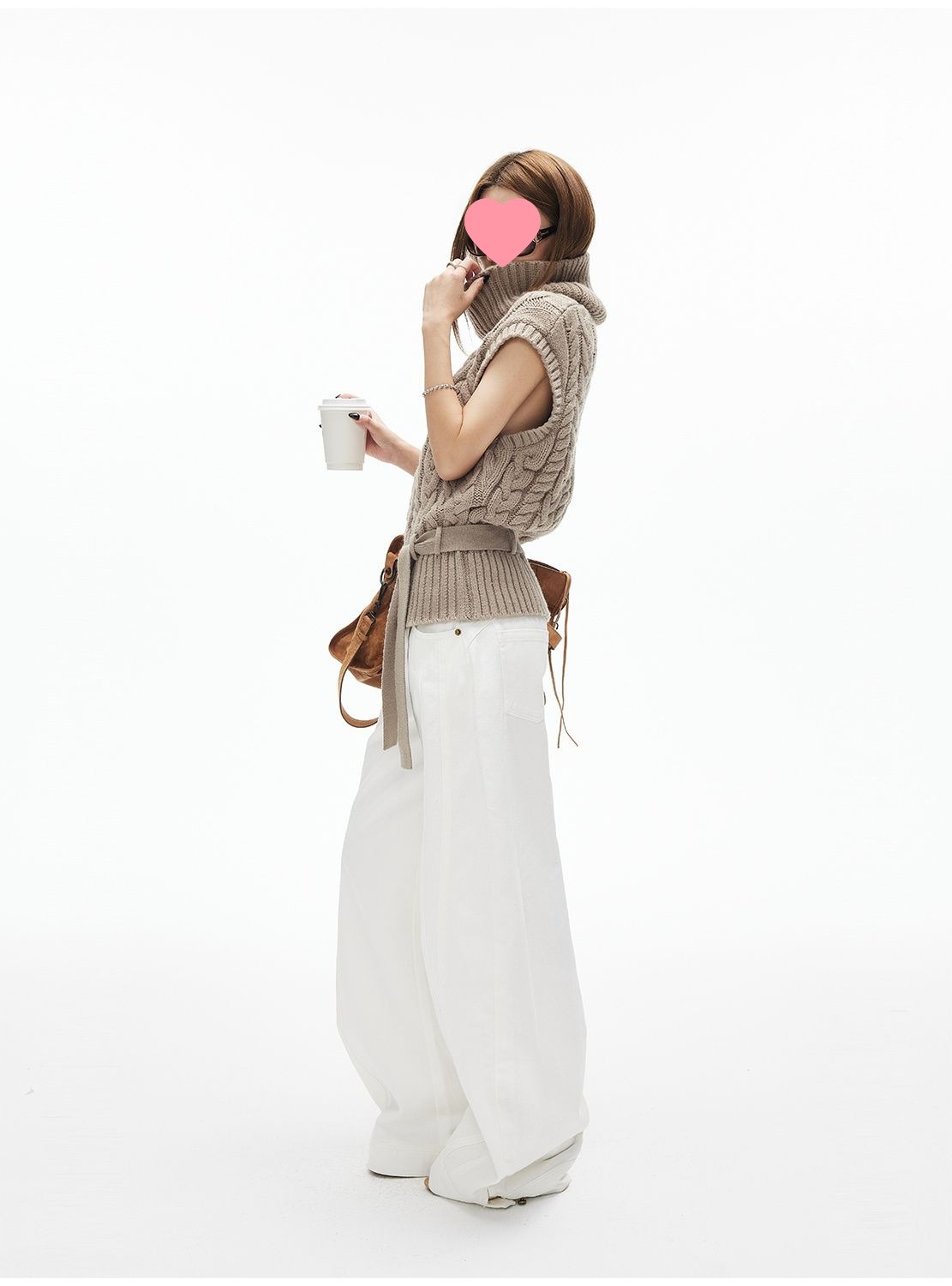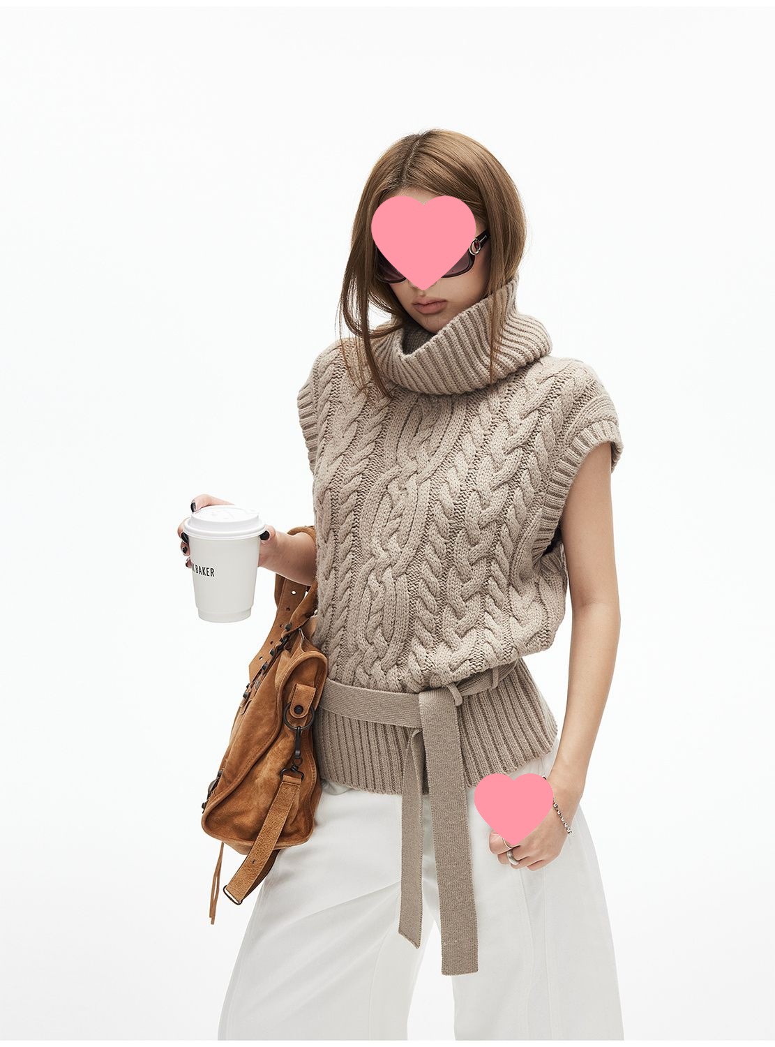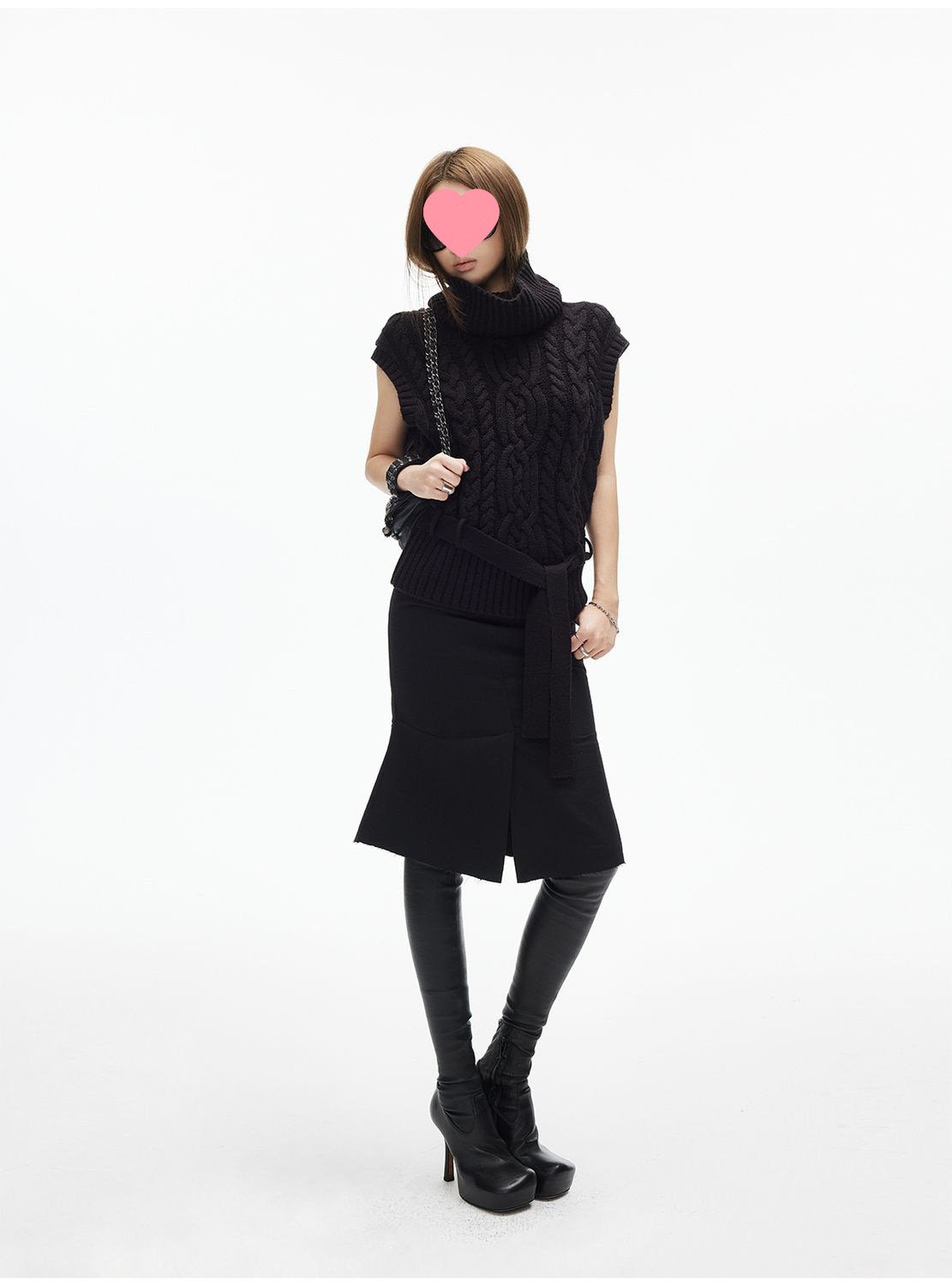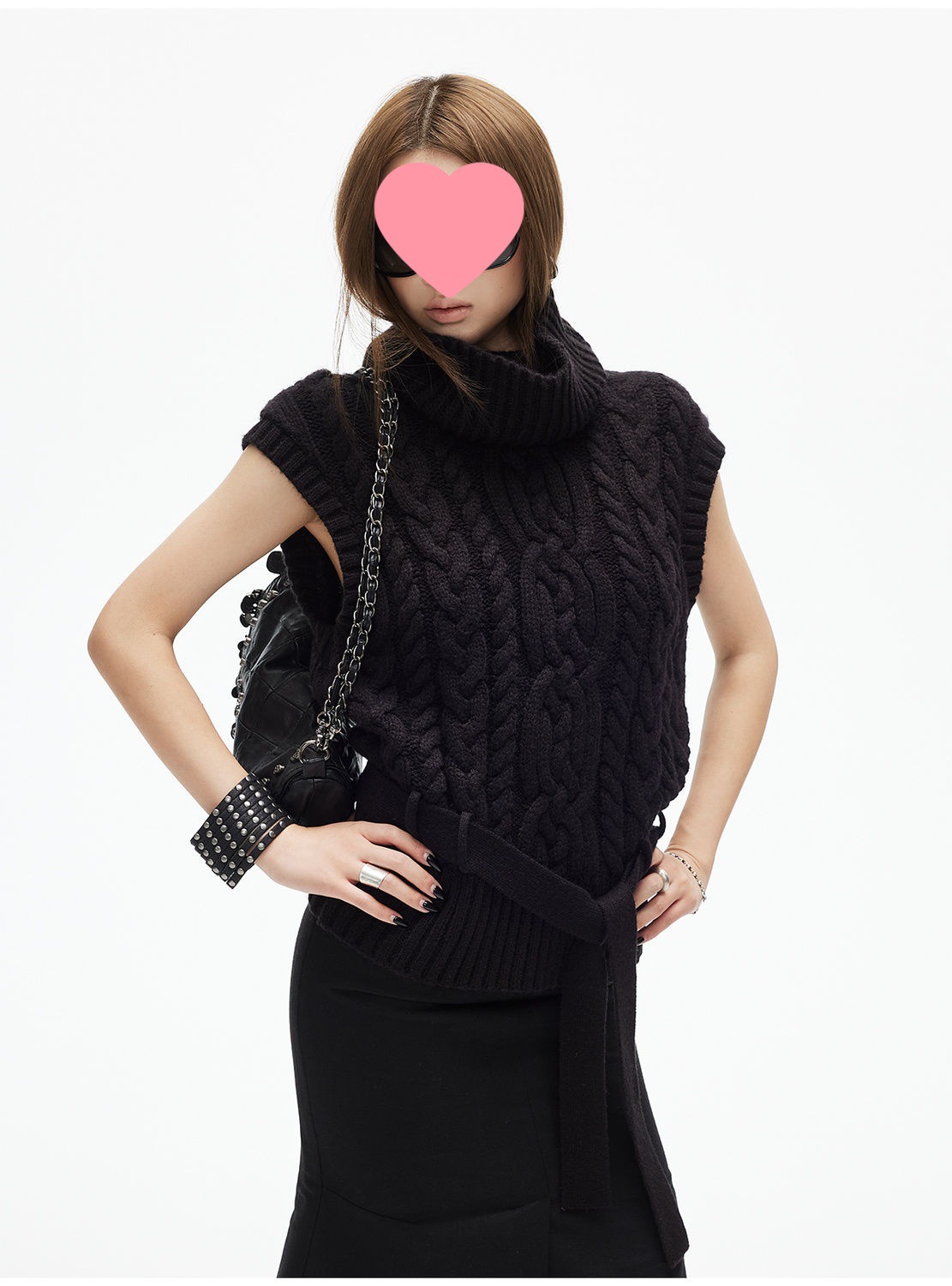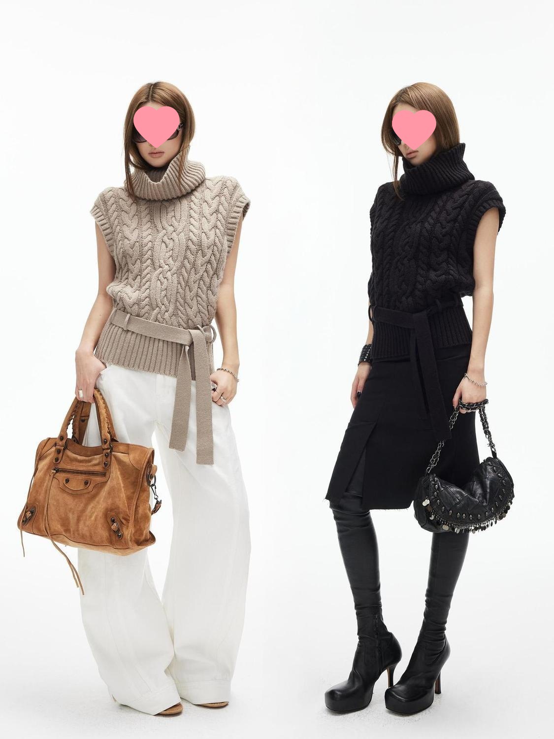 iamxiaa*粗针编织立体大麻花高领小飞袖腰带绞花毛衣背心双色可选