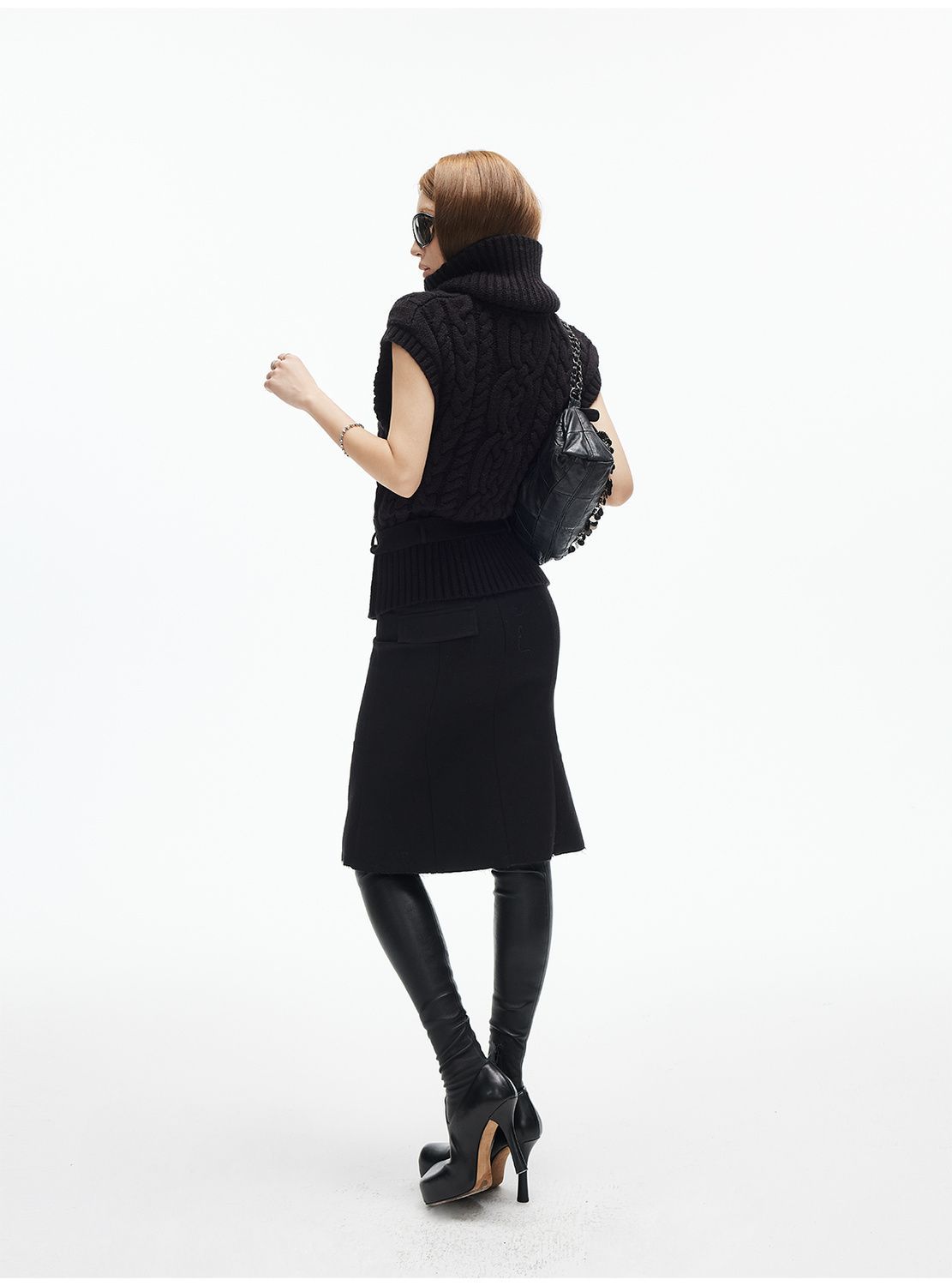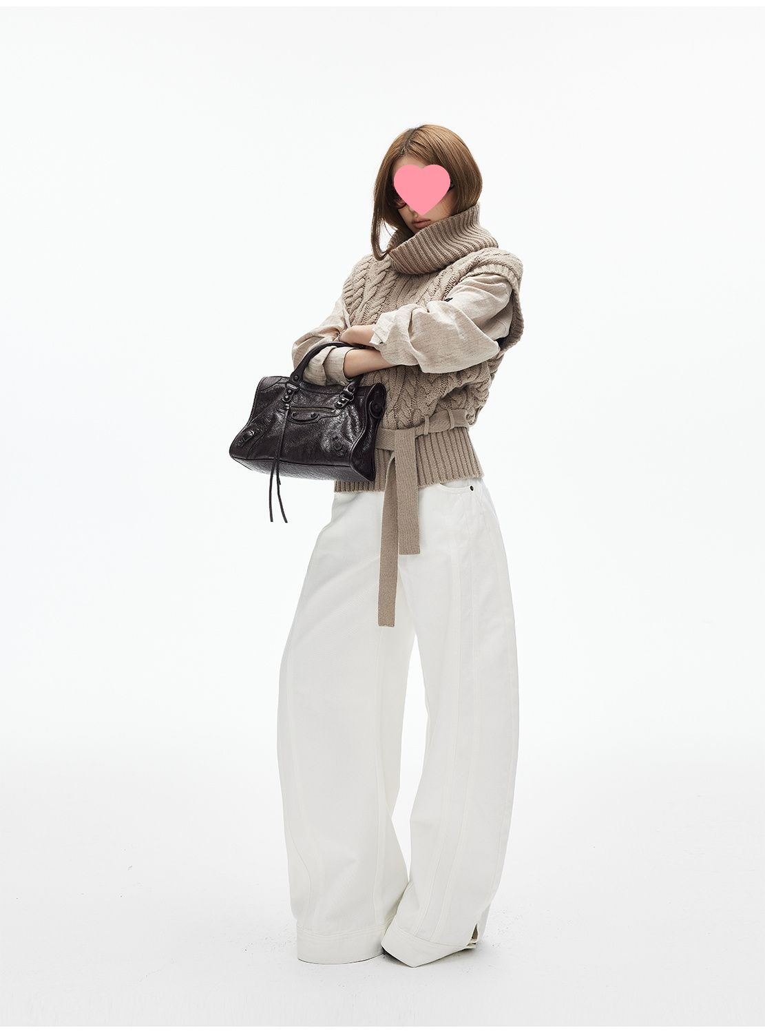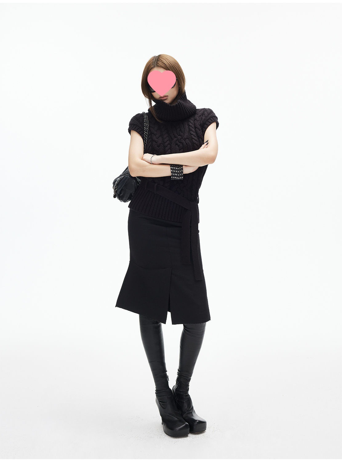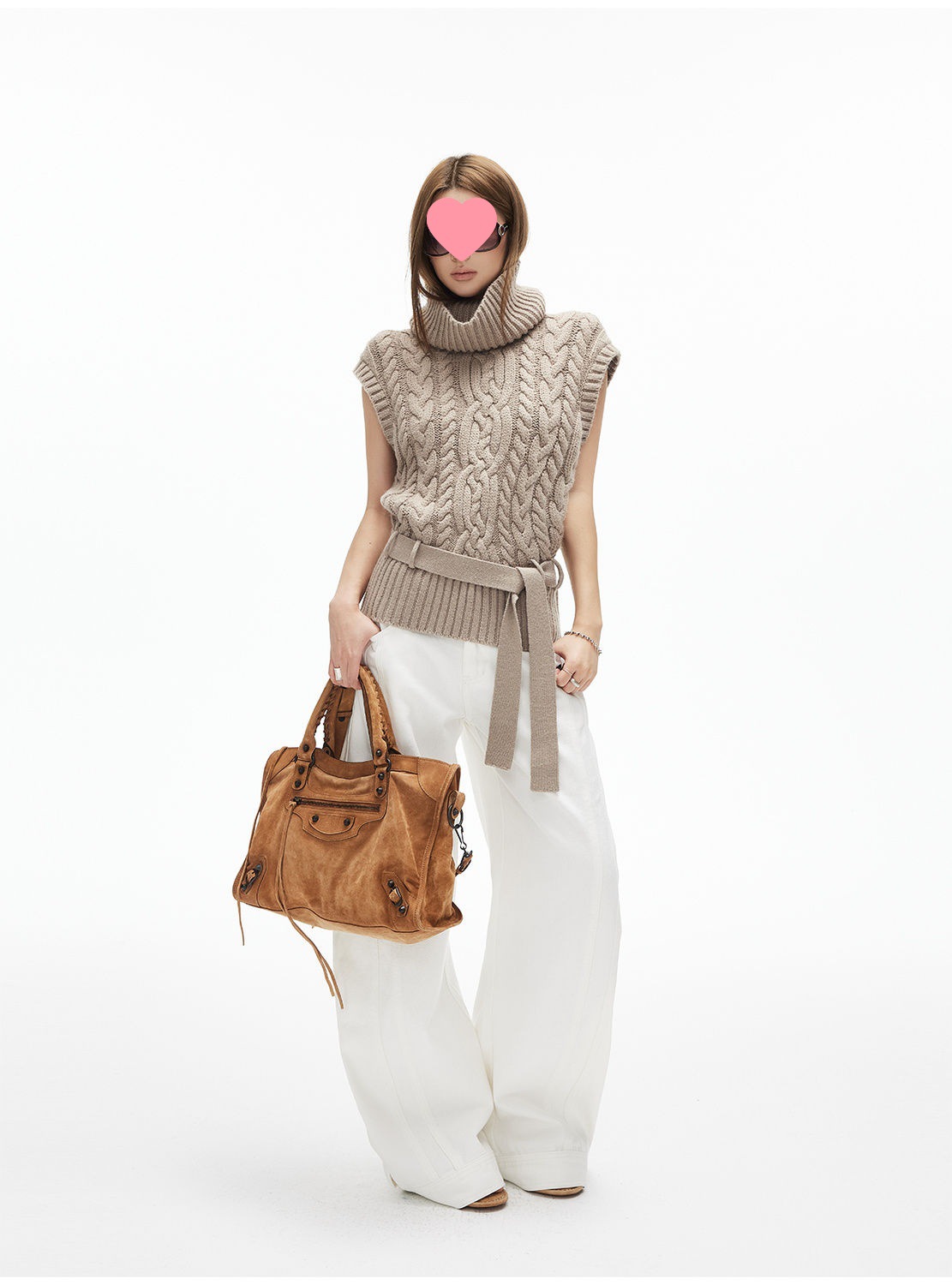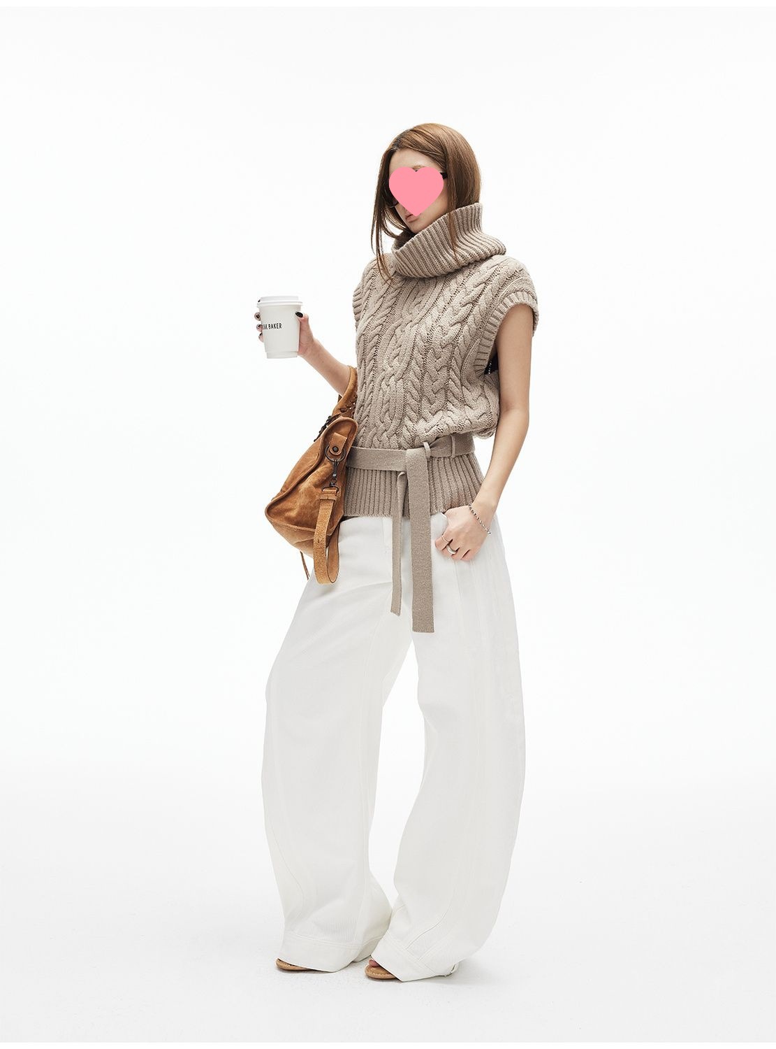iamxiaa*粗针编织立体大麻花高领小飞袖腰带绞花毛衣背心双色可选