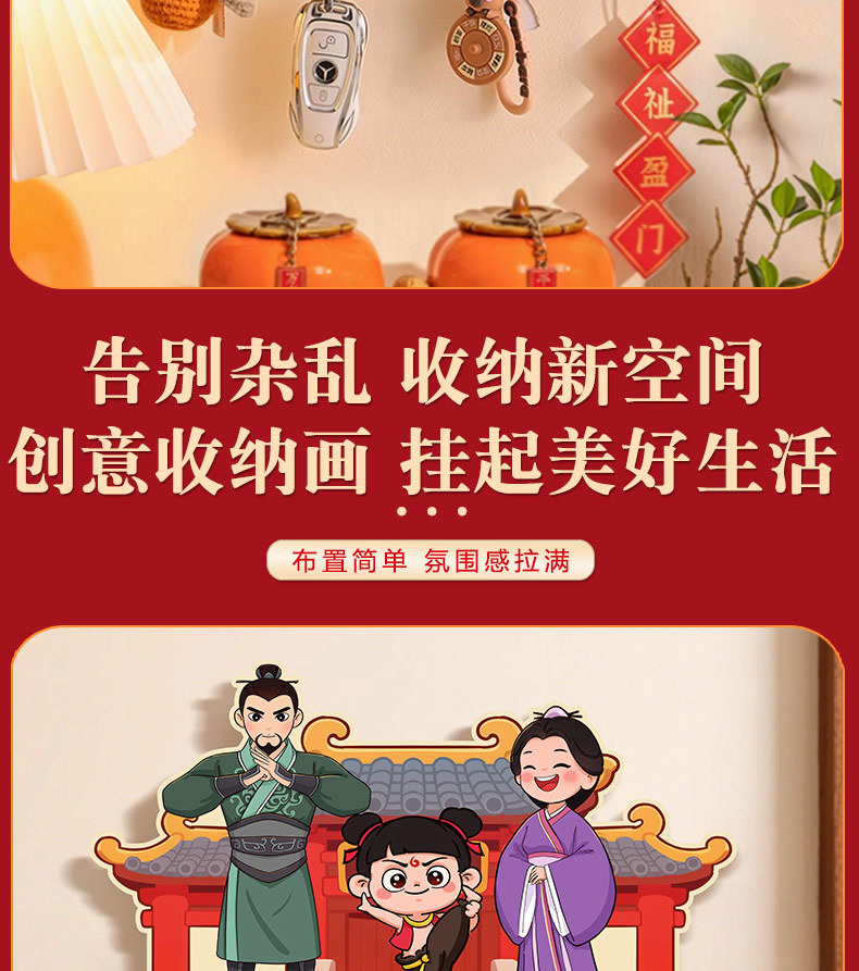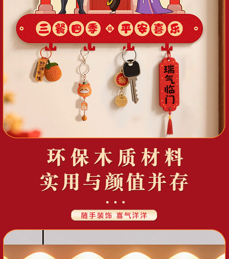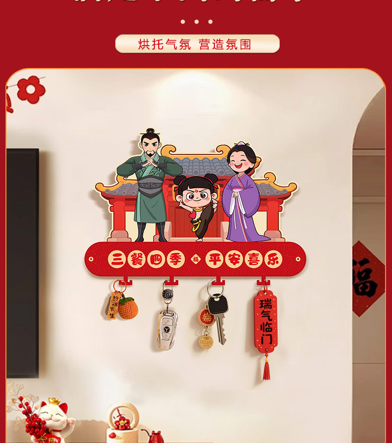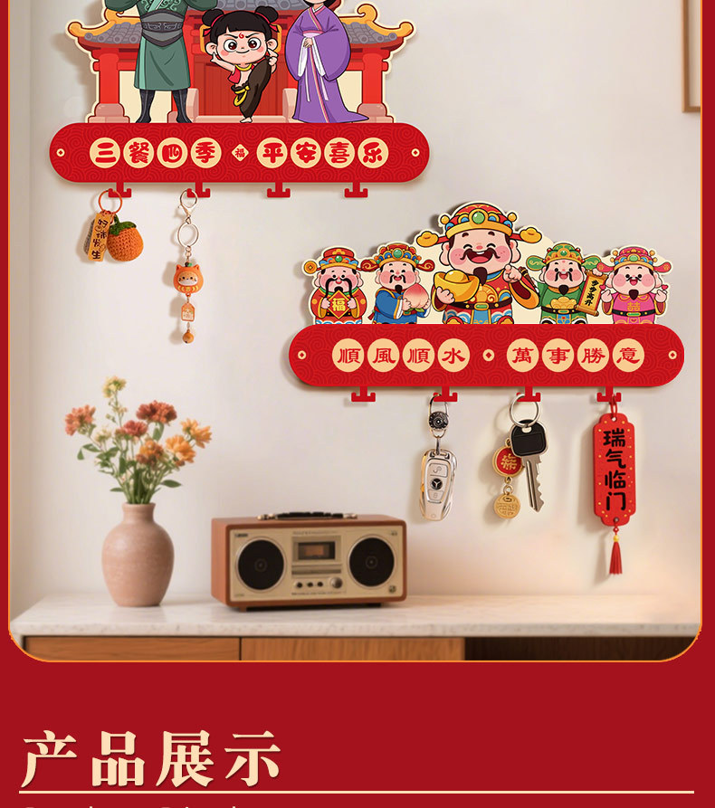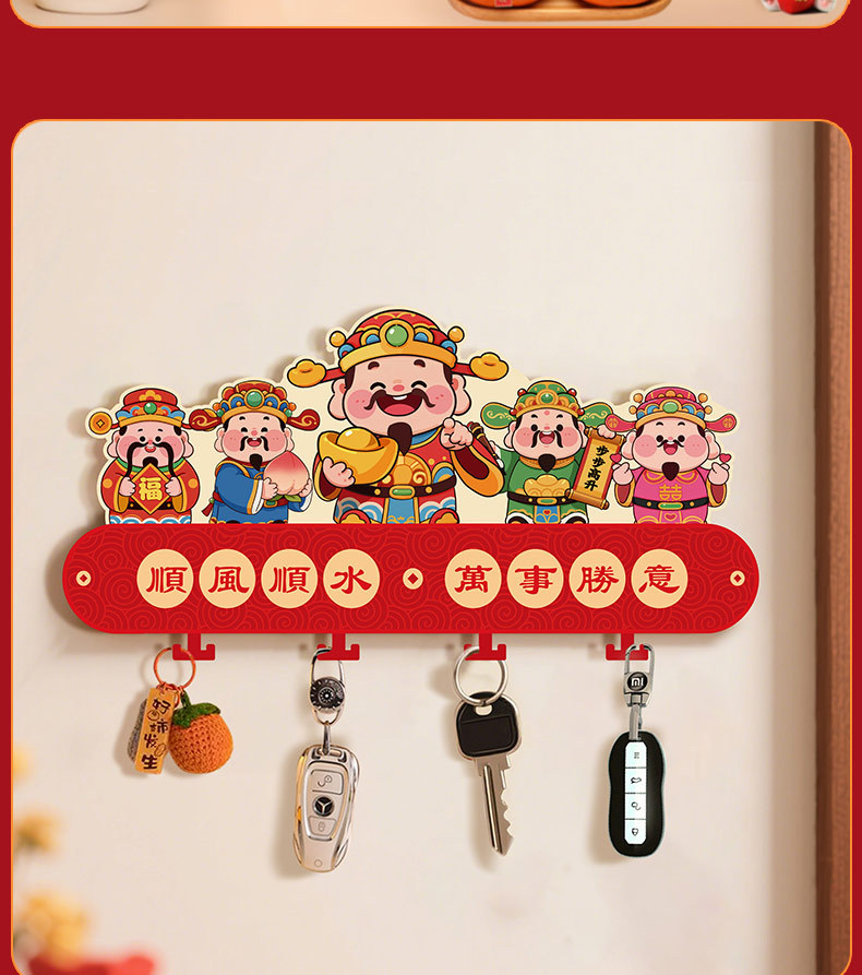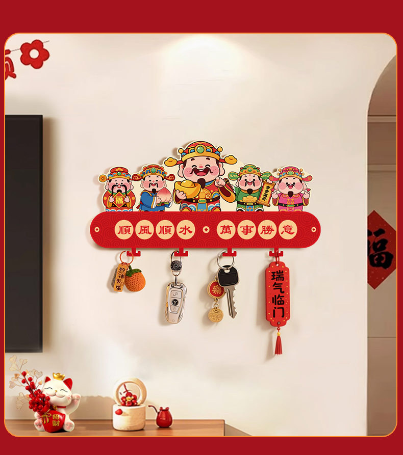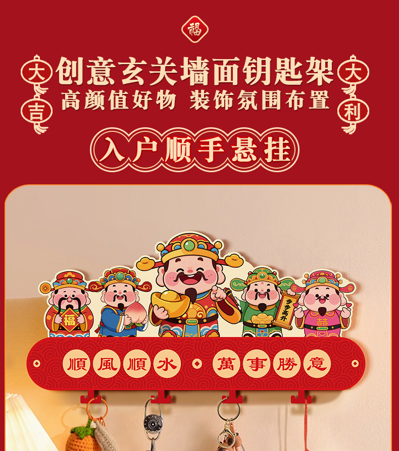 2026新款五路财神入户玄关壁挂式钥匙收纳架新年乔迁免打孔装饰品