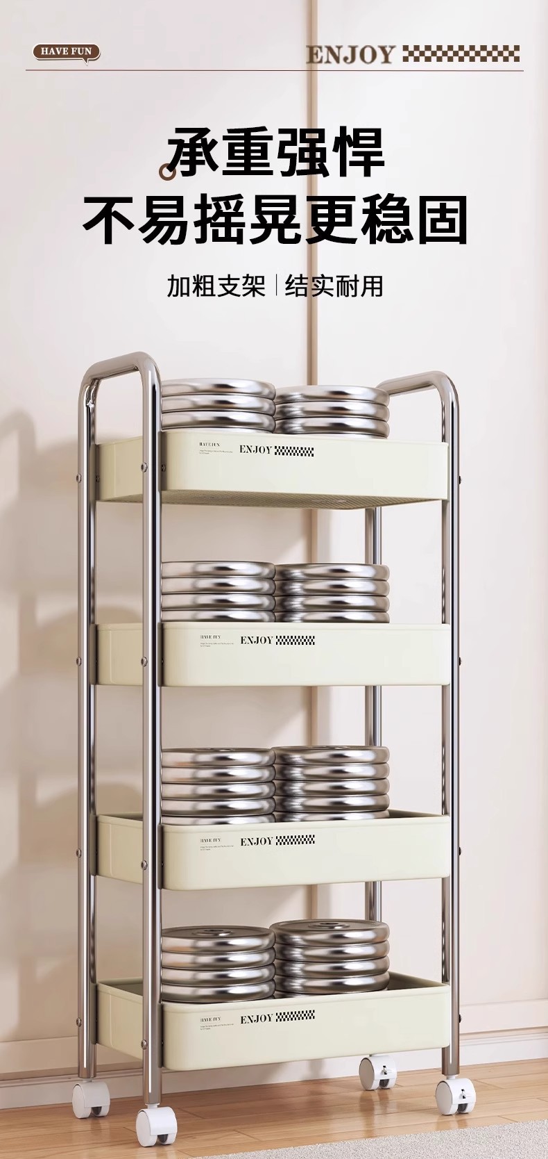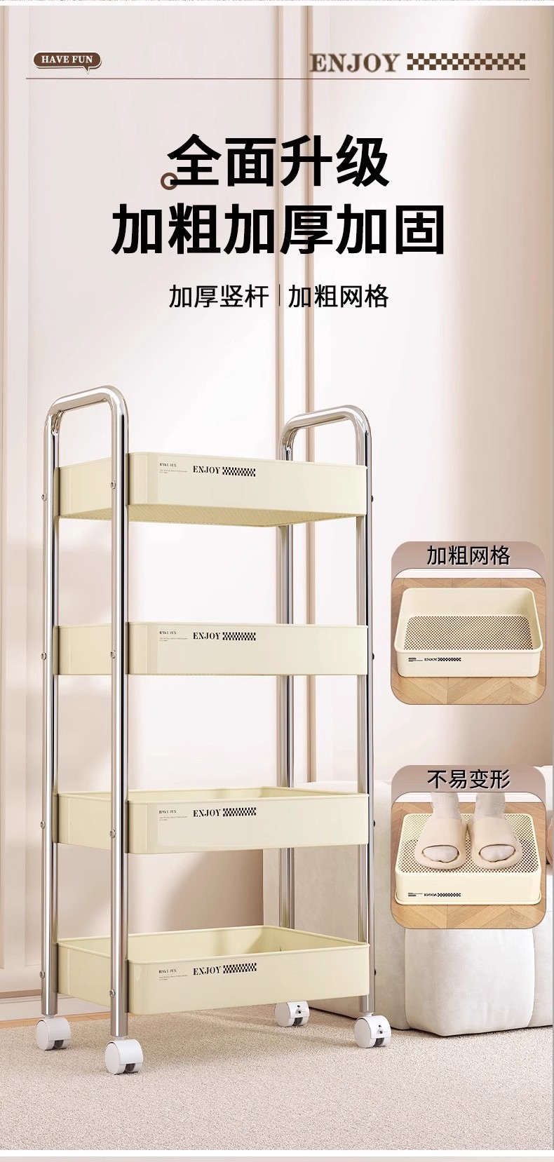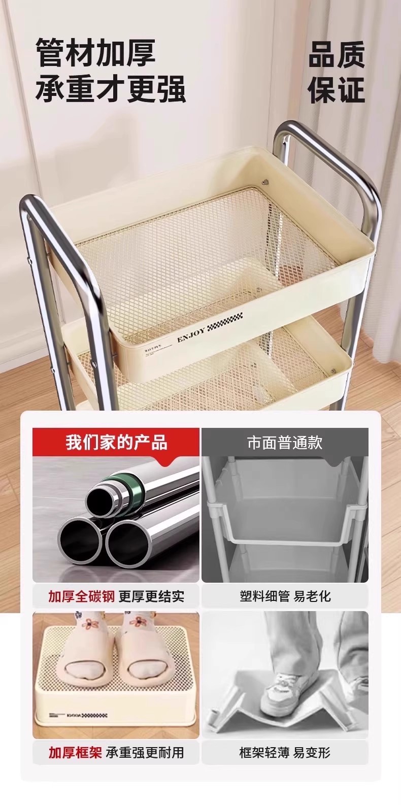 新款碳钢小推车折叠多层储物架置物架可移动厨房卧室零食收纳推车