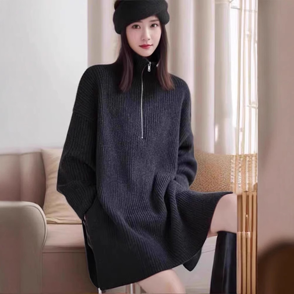 秋冬の新型の中で長いタイプのオープンフォークの純粋なウールのセーターの女性のカジュアルなセットの頭の襟のファスナーの上着