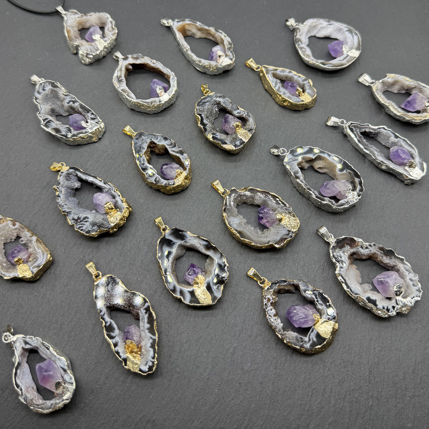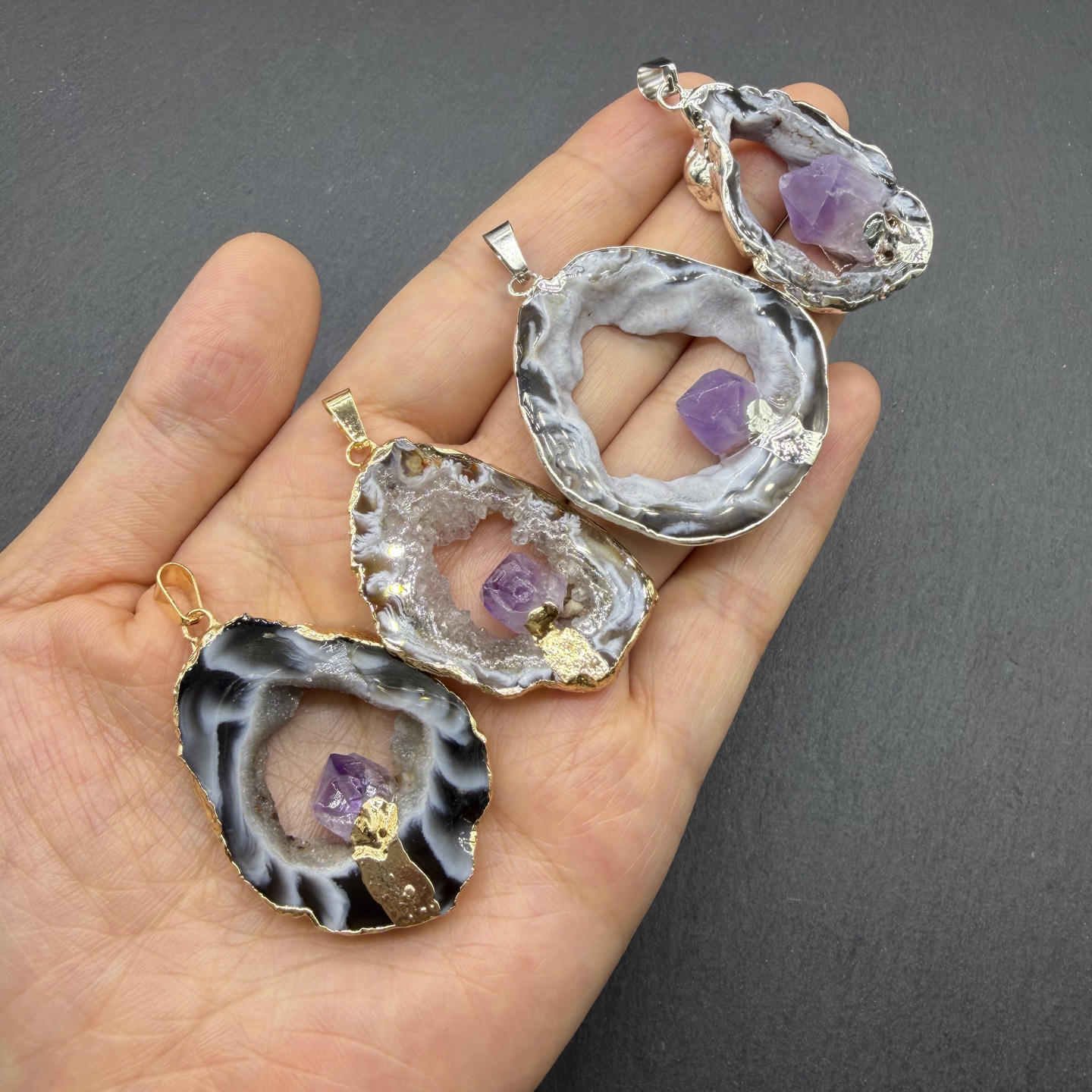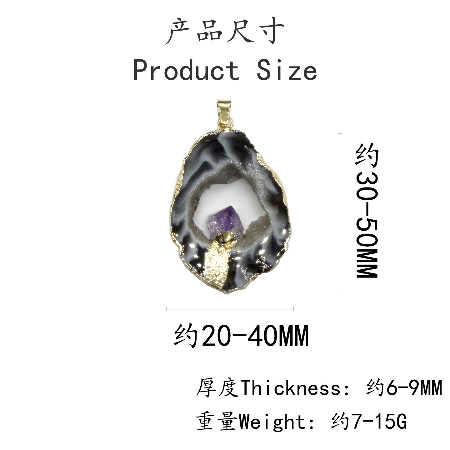 不规则玛瑙片空心原石水晶洞切片吊坠镶嵌紫水晶牙镀金边项坠饰品