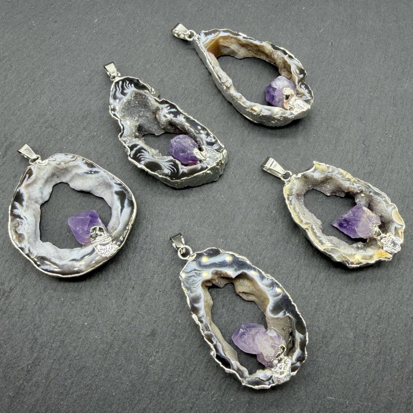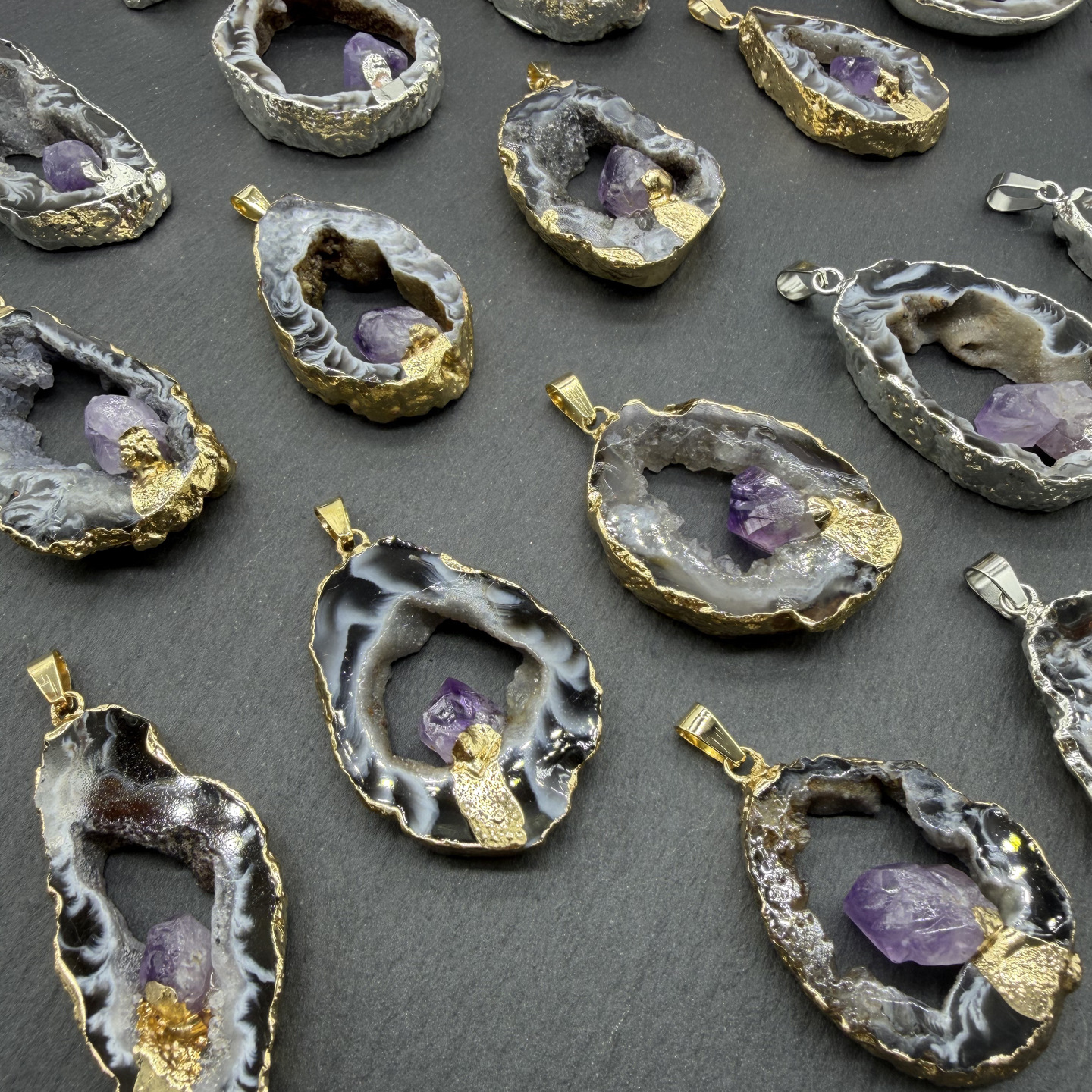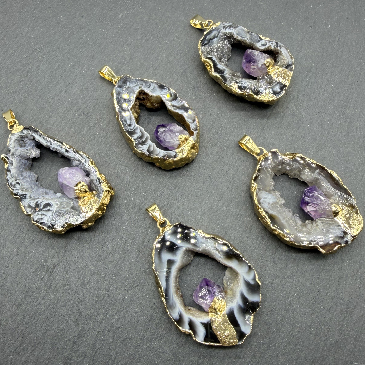 不规则玛瑙片空心原石水晶洞切片吊坠镶嵌紫水晶牙镀金边项坠饰品