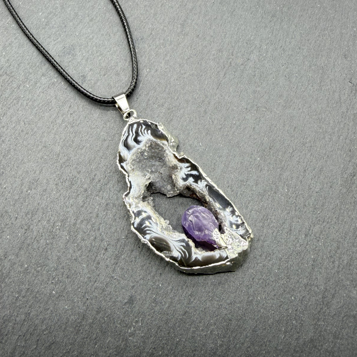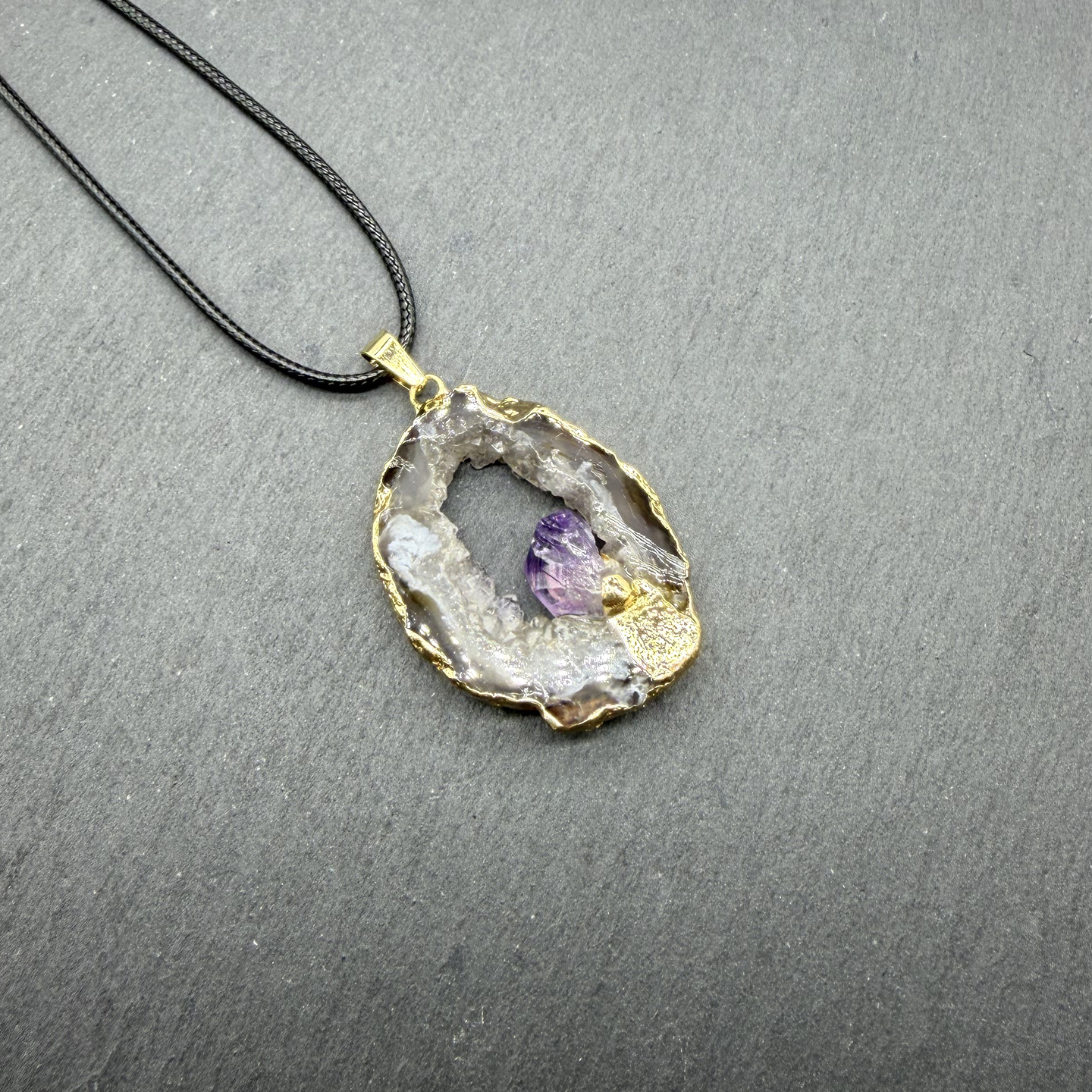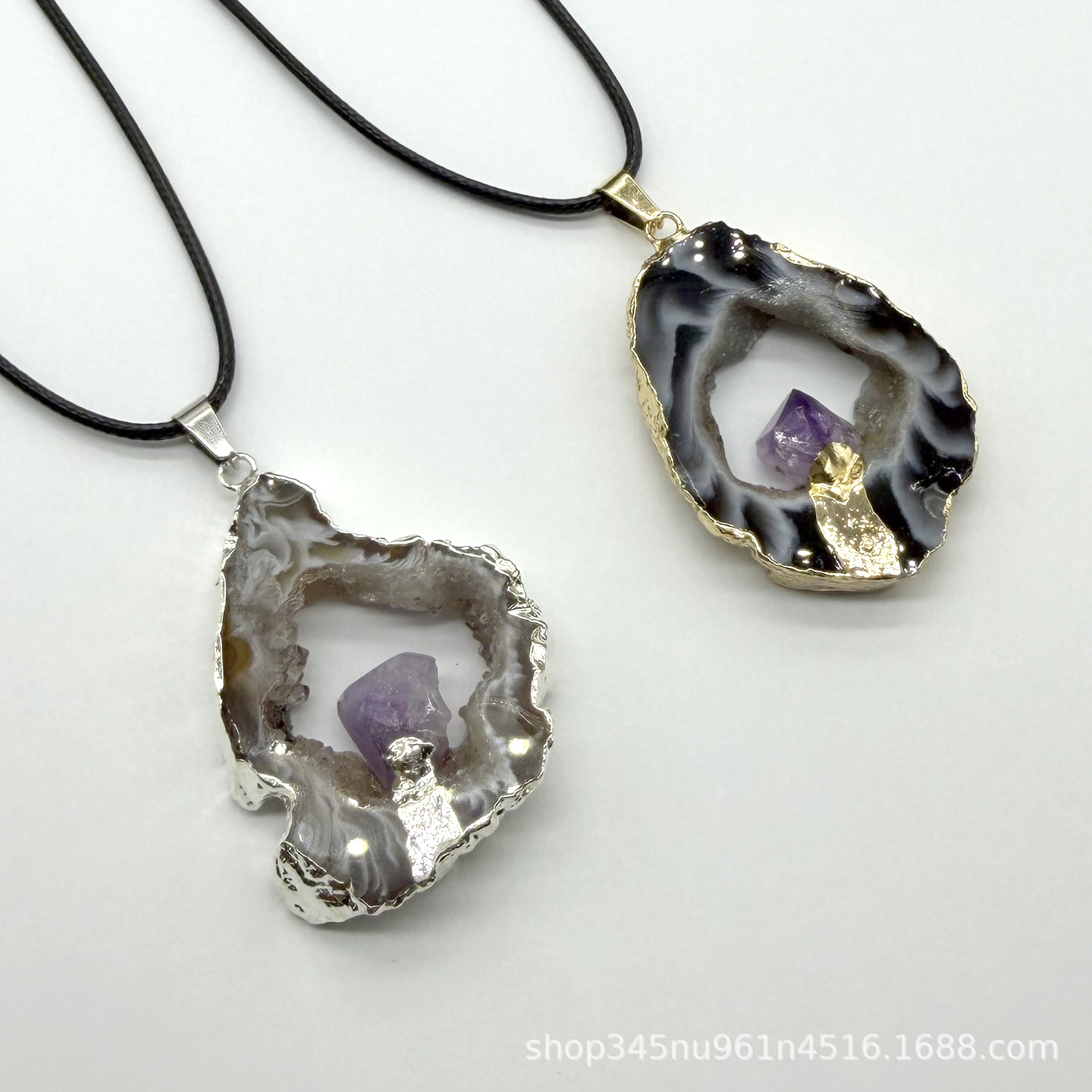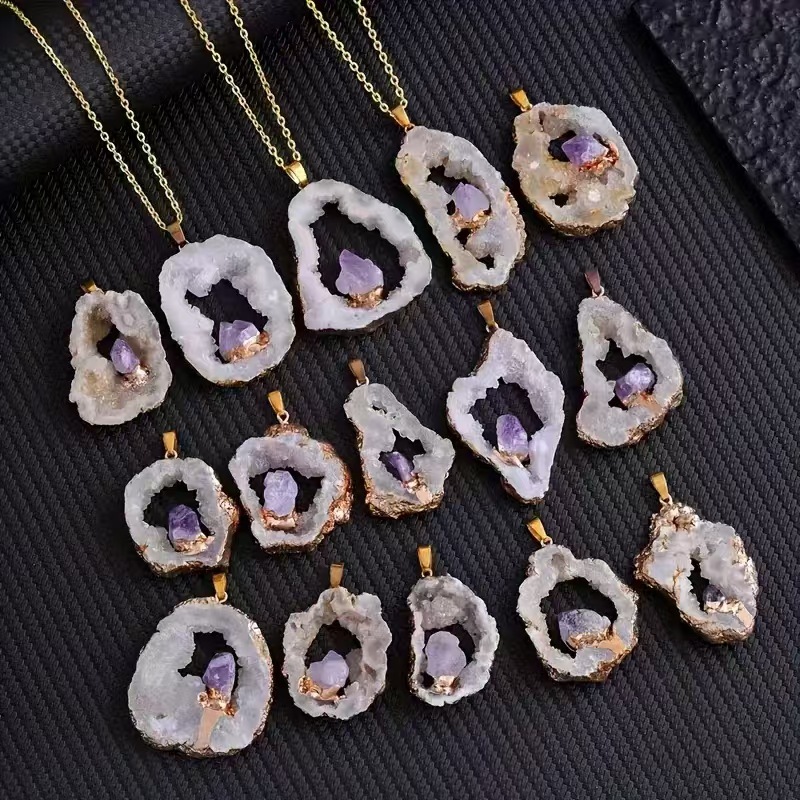 天然水晶洞ペンダント瑪瑙中空洞スライスネックレス象眼紫水晶金色銀色縁ペンダント