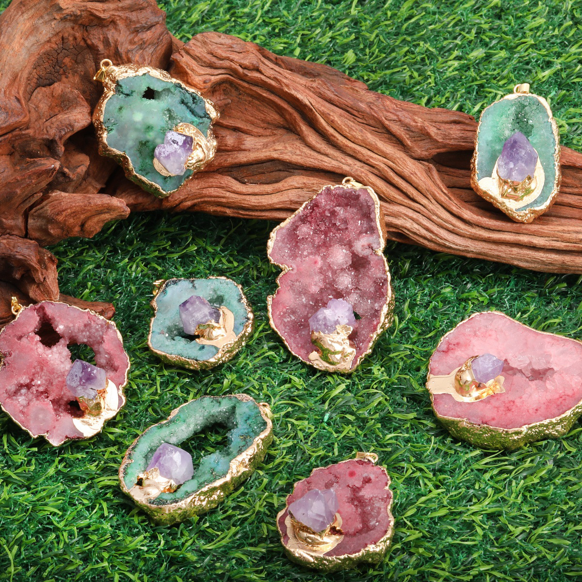 天然水晶洞窟原石中空原石スライスペンダント象嵌アメジスト金メッキエッジペンダント工場直販