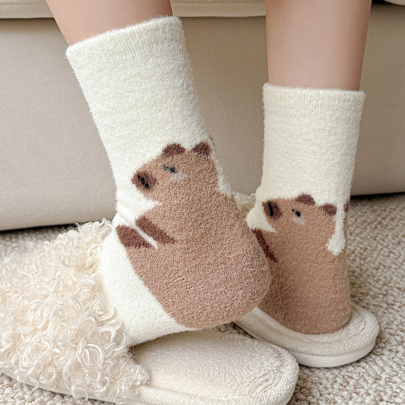 澳绒袜子女秋冬季保暖柔软加厚毛茸茸可爱卡皮巴拉地板中筒月子袜
