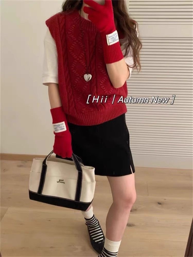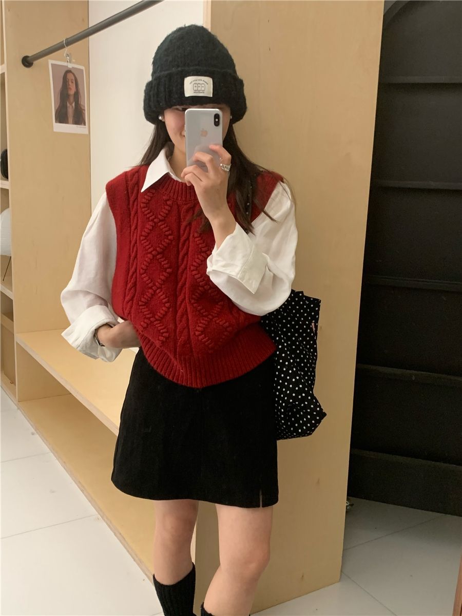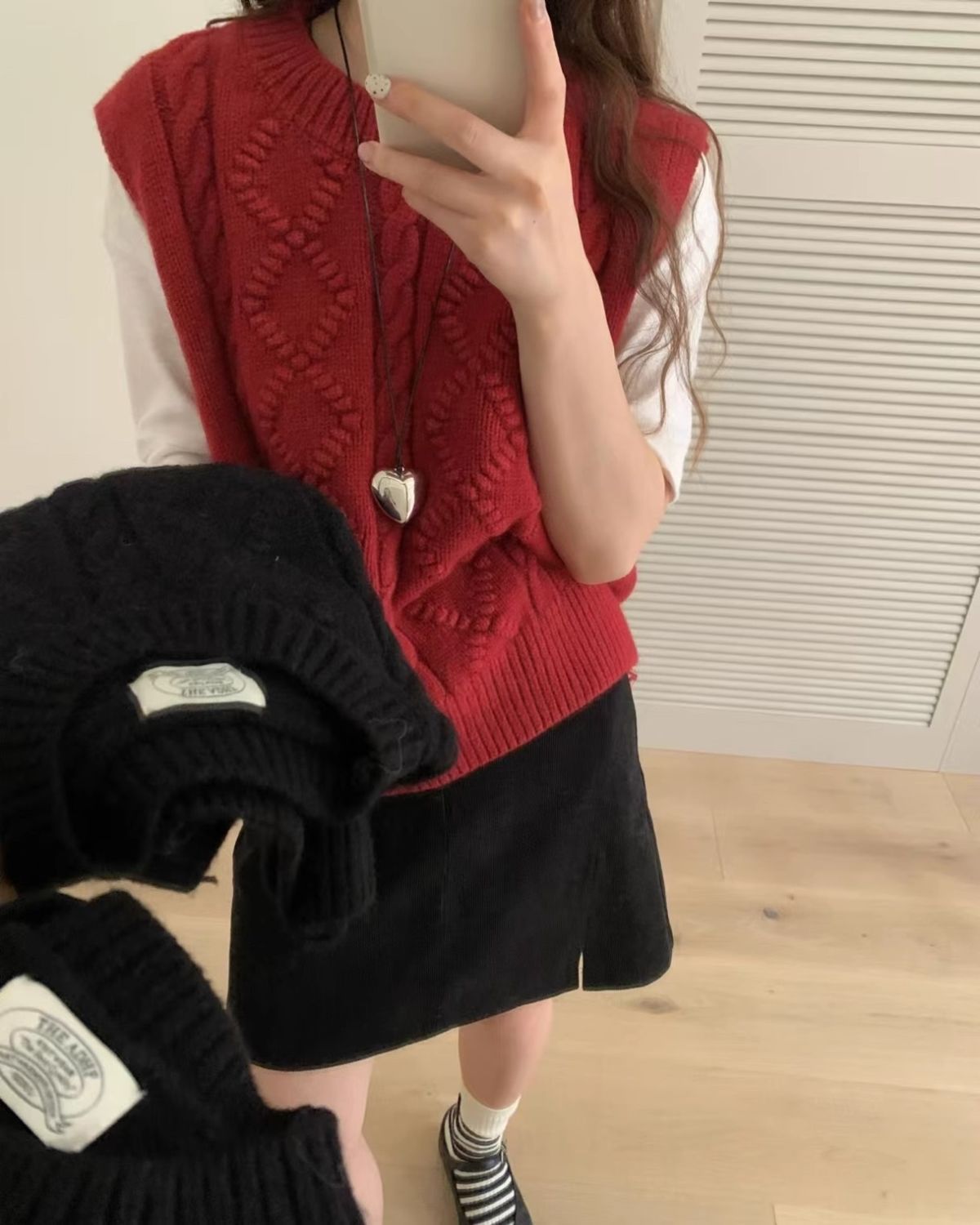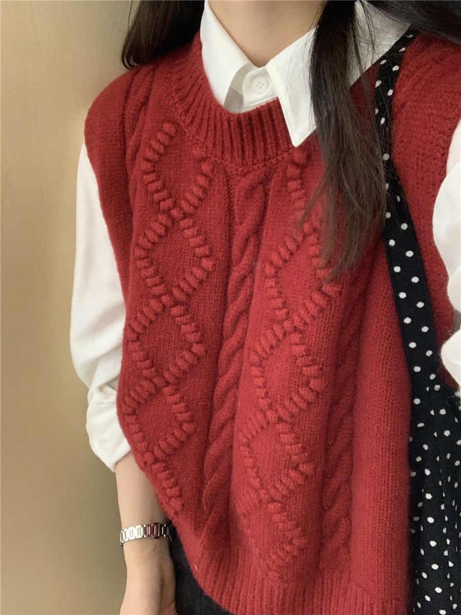 おしゃれな麻花vネックのニットベストを重ねて着ます。
