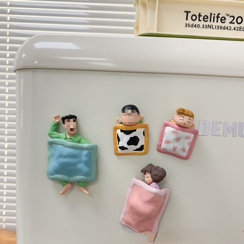 クレヨンしんちゃん一家のマグネット式冷蔵庫に飾り物を貼っています。