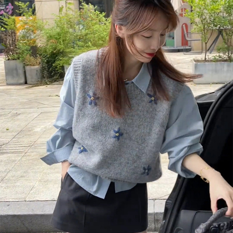 浅い花の灰色のセーターのベストの女性の2025春秋の新型の丸首のニットの馬の甲は重ねて短い上着の気質を着て着ます。