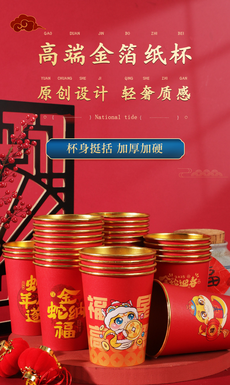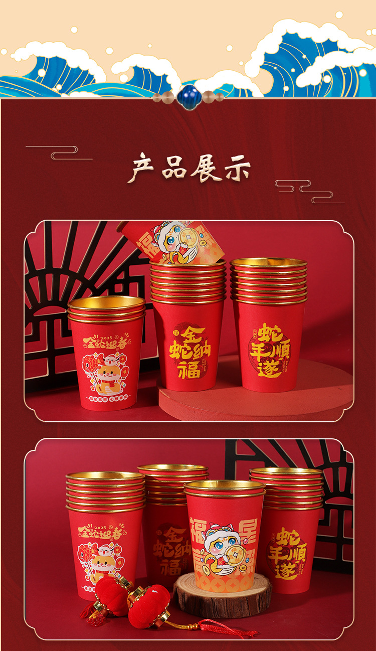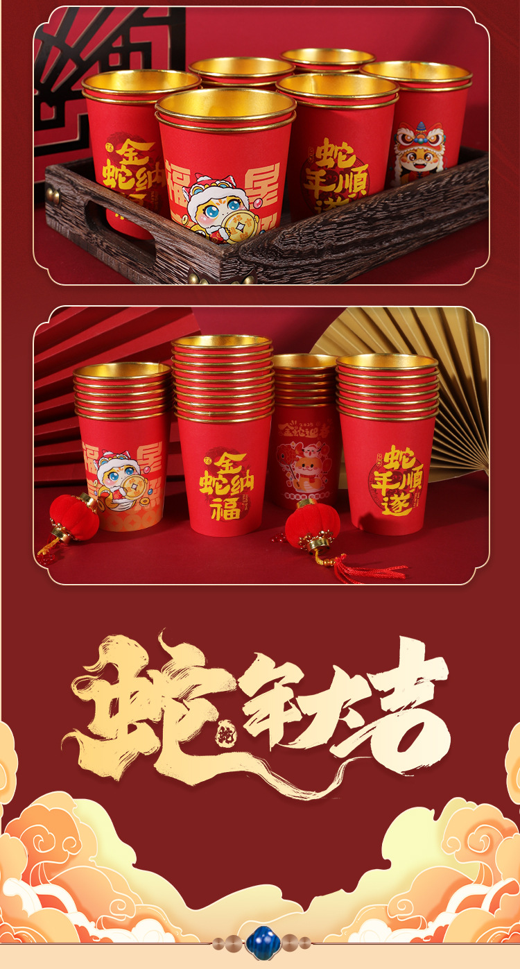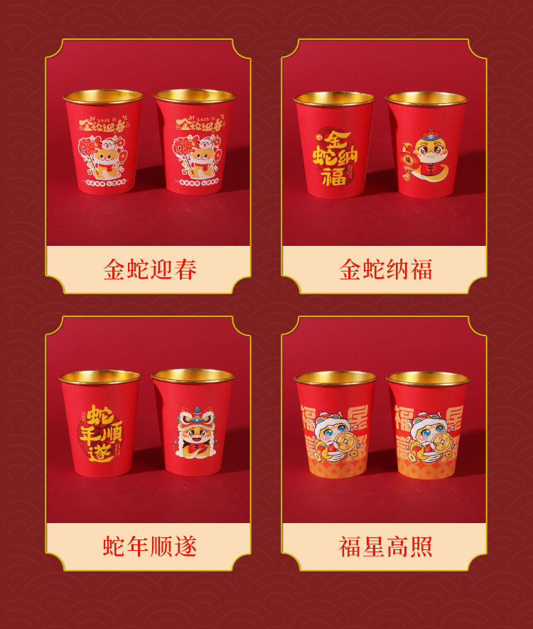 2025蛇年新年紙コップ使い捨て金箔紙コップ年越しカップ旧正月家庭用赤いお祝い卸売り
