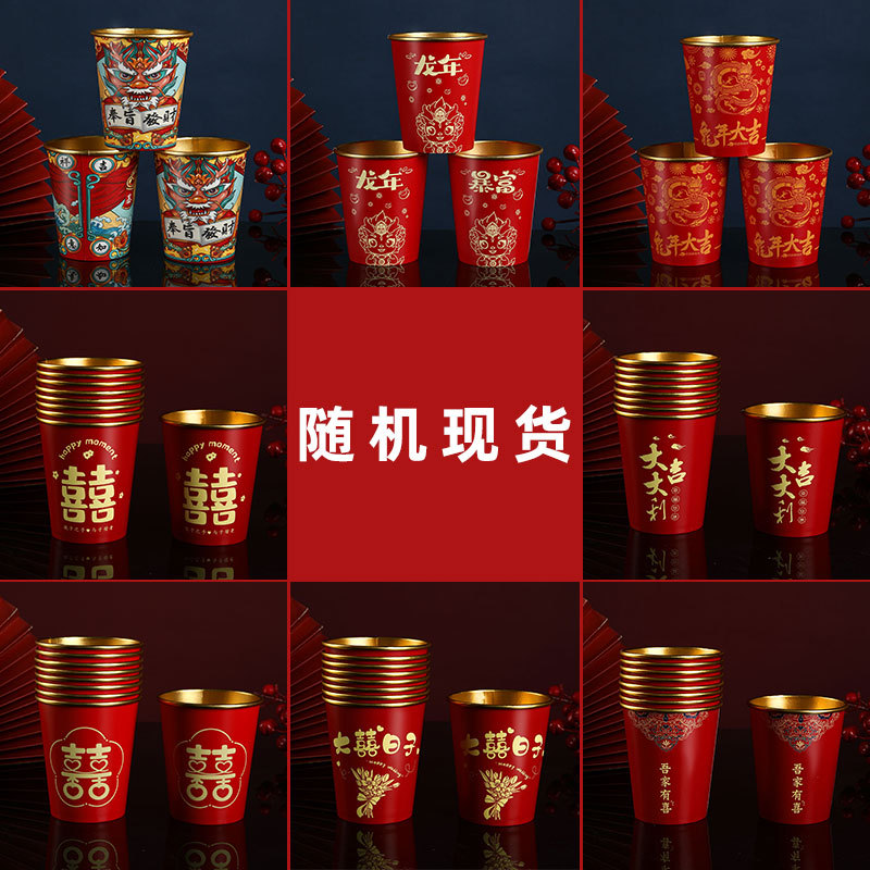 厚手の使い捨て結婚紙コップ結婚式家庭用喜字コップ印ロゴ金箔旧正月赤いコップ