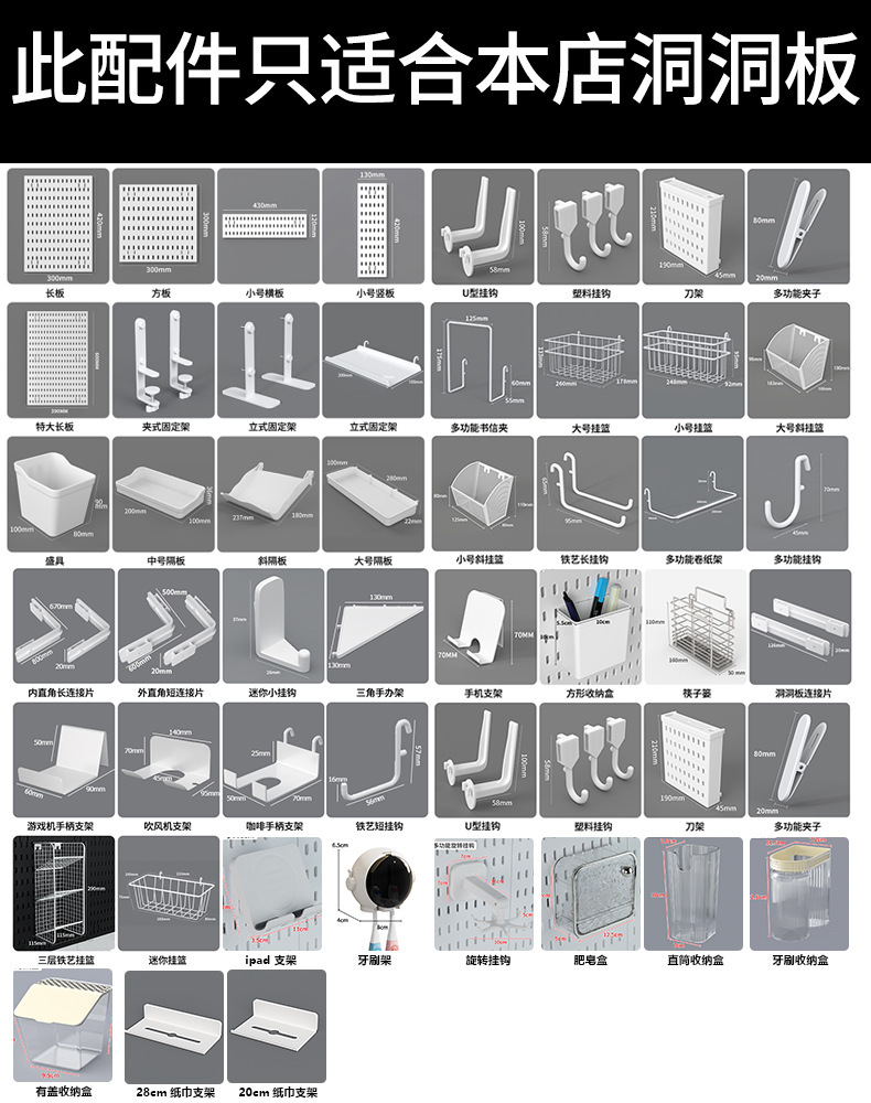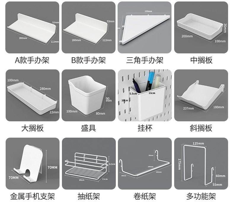【新款】圆形小挂钩5个黑色,白色无痕钉4个装,洞洞板-组合2 大横板黑,洞洞板-组合2方板黑,洞洞板-组合2竖板黑,洞洞板-组合3,洞洞板-组合3竖板黑,洞洞板-组合4大横板黑,洞洞板-组合4方板黑,白色洞洞板-组合2大横板,洞洞板-组合2方板,洞洞板-组合2竖板白,洞洞板-组合3竖板白,洞洞板-组合4大横板,J型小挂钩 5个 黑色,铁艺迷你夹子 黑色,大挂钩 黑色,ABS游戏手柄支架 黑色,键盘固定支架 黑色,铁艺手机架 黑色,弧形耳机挂钩 黑色,鼠标支架 黑色,iPad活动支架 黑色,白B款转接头+蛇条支架,黑B款转接头+蛇条支架,【新款】横-夹线器15个黑色,【新款】竖-夹线器15个黑色,盛具 黑色,20cm纸巾隔板黑,28cm纸巾隔板黑色,多功能中搁板 黑色【可沥水】,大搁板280*100*22 黑色【可沥水】,大号方板 【黑色限时冲量】,大号30*30主板 【白色限时冲量】,加大42*30长板主板 黑色,加大42*30长板主板 白色,大号B横板黑色,大号B横板白色,特大长板ABS黑色,特大长板abs白色,黑色小竖板,白色小竖板,黑色小横板,白色小横板,小方板19.5*22cm 白色,小方板19.5*22cm 黑色,C号特大横板-白,C号特大横板-黑,铁艺夹子 2个 黑色,多功能铁艺挂钩B 3个 黑色,铁制长挂钩 【黑】2个,铁制短挂钩 【黑】2个,迷你小挂钩 黑色,章鱼旋转挂钩 白色,多功能卷纸架 黑色,多功能书信架 黑色,锅盖支架黑色,透明挂杯,黑色收纳盒,水波纹肥皂盒,白 剃须刀支架,透明 剃须刀支架,太空人牙刷架 白色,透明雨伞收纳盒,透明牙刷收纳盒,透明有盖收纳盒,铁艺咖啡滤纸架黑色,【新款】ABS咖啡手柄黑色,咖啡手柄支架 黑色,大号咖啡手柄支架 黑色,吹风机支架 黑色,斜搁板 黑色,【新款】小包纸巾挂篮黑色,铁艺纸巾挂篮 黑色,铁艺三层挂篮 黑色,小斜口篮 黑色,大斜口篮 黑色,迷你小挂篮 黑色,手办盒【9*9cm】白色,手办盒【9*9cm】透明,手办盒【9*9cm】杏黄色,手办盒【9*28cm】白色,手办盒【9*28cm】透明,手办盒【9*28cm】杏黄色,手办盒【16*28cm】白色,手办盒【16*28cm】透明,手办盒【16*28cm】杏黄色
