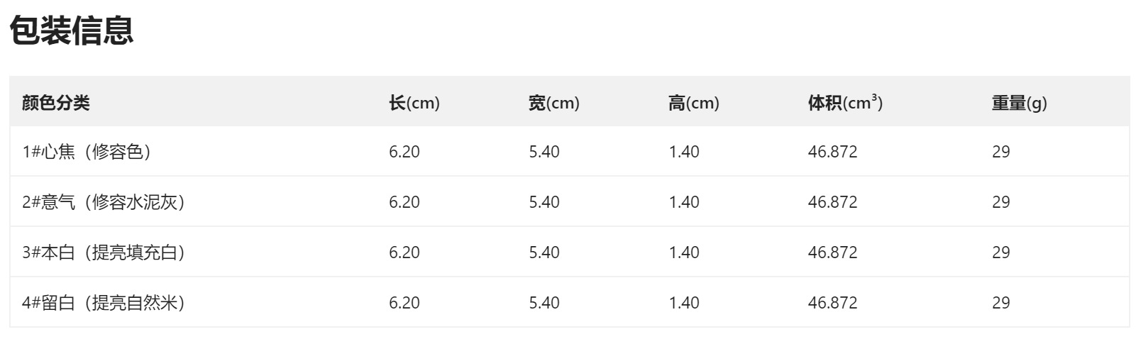 颜色分类 1#心焦(修容色),2#意气(修容水泥灰),3#本白(提亮填充白),4#留白(提亮自然米)