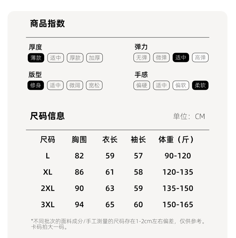 面料厚薄(克重) 适中(161-180克/平米)