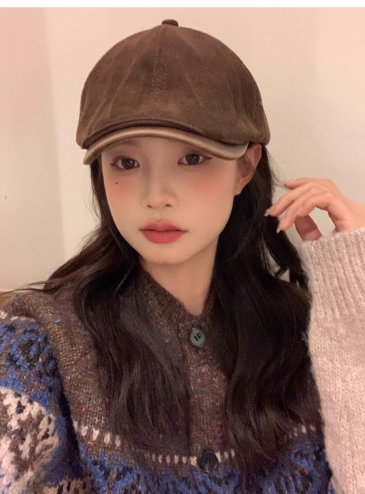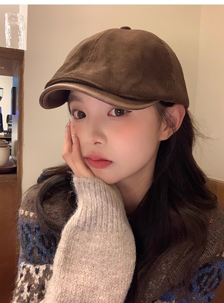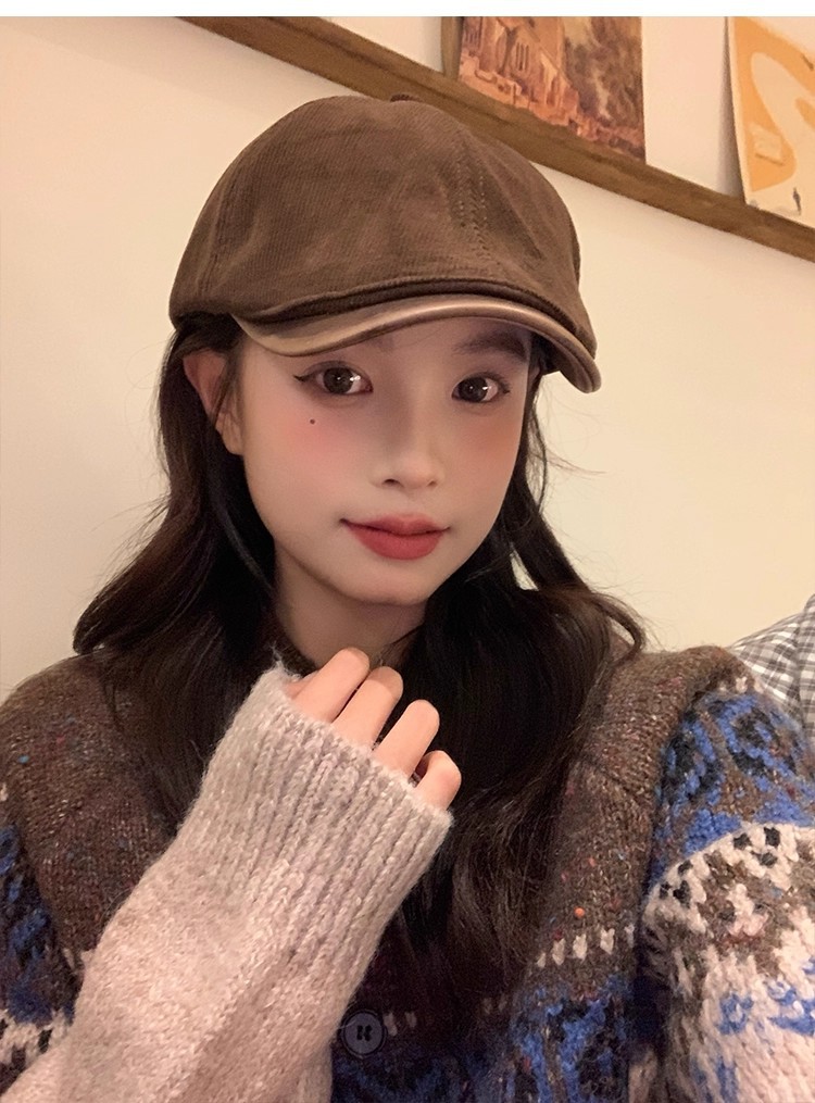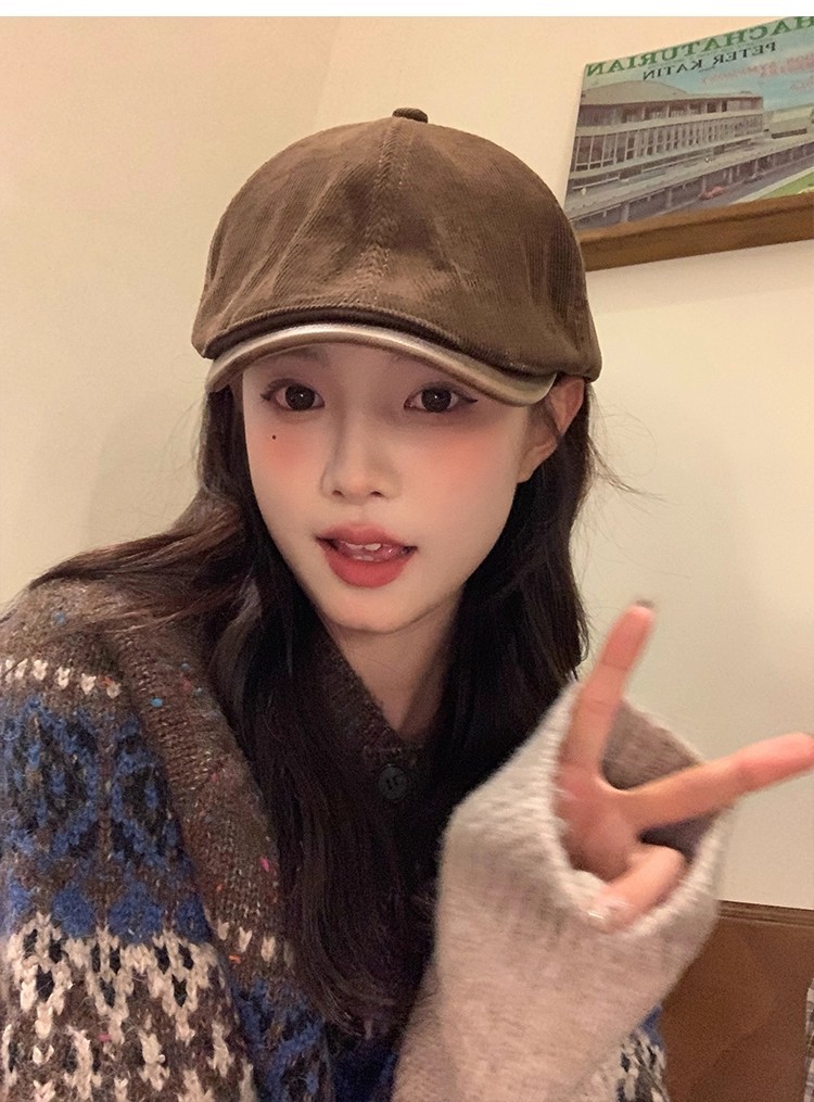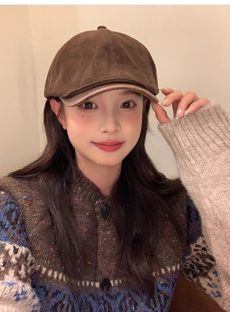 韩版复古灯芯绒前进帽女生春季咖啡色画家帽子时尚英伦风鸭舌帽潮