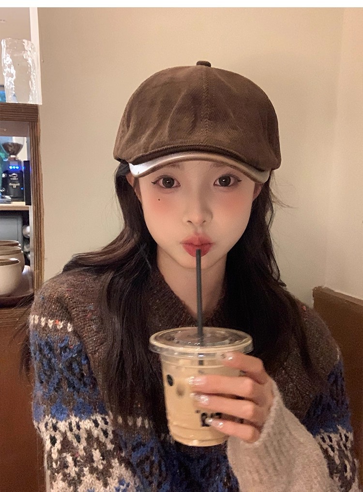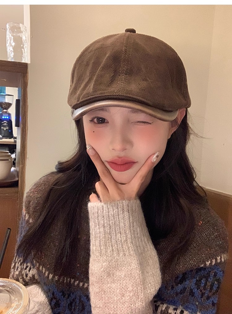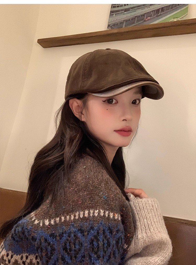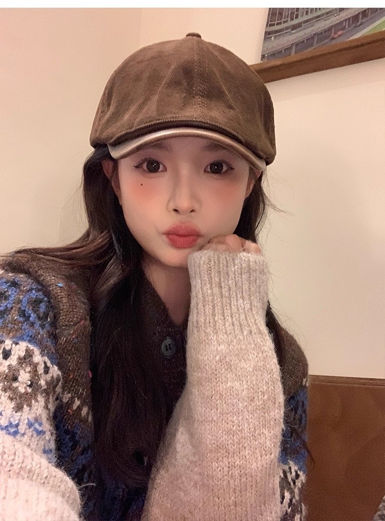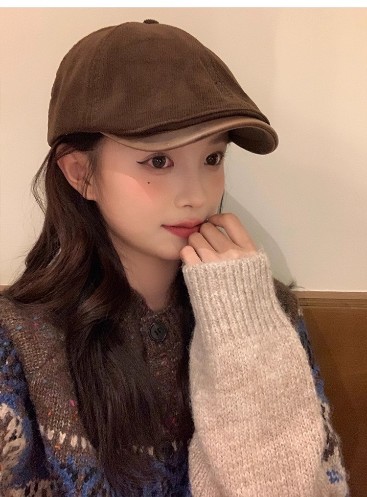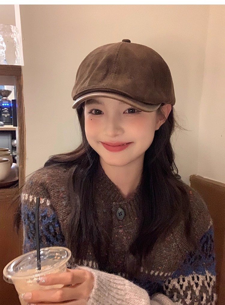 韩版复古灯芯绒前进帽女生春季咖啡色画家帽子时尚英伦风鸭舌帽潮