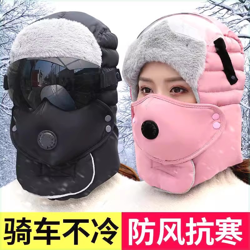 帽子の女性は冬にベルベットをつけて防風マスクを厚くして保温神器の電気自動車に乗って男性の頭に綿の帽子の雷鋒帽をかぶせた