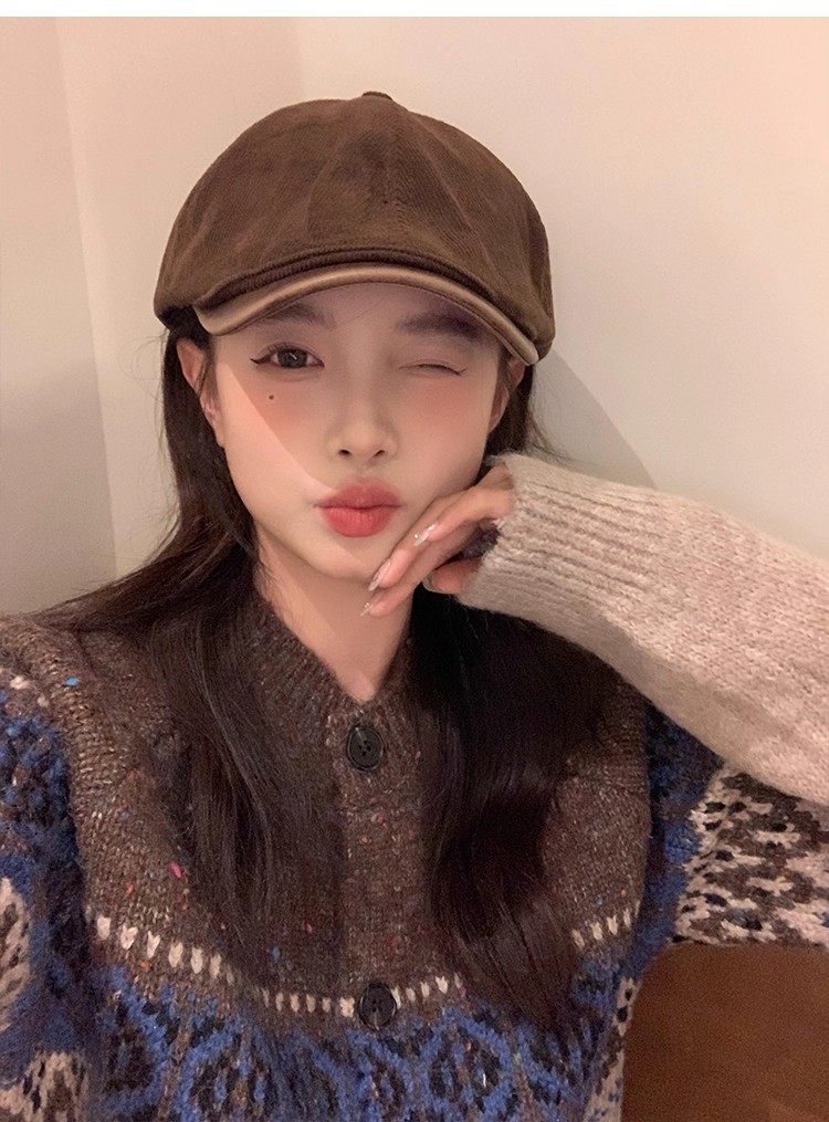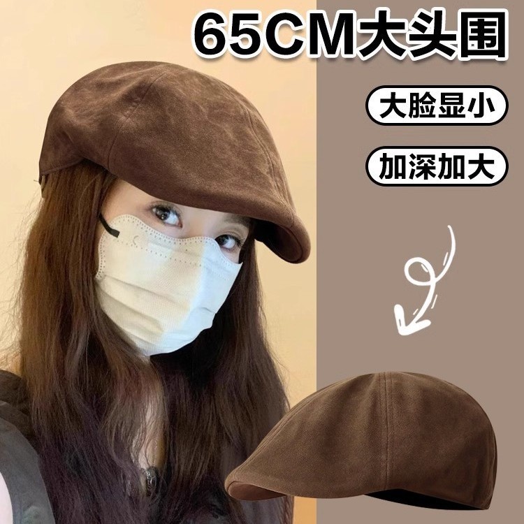 日系复古麂皮绒咖色前进帽女大头围显脸小文艺百搭反戴贝雷帽子潮