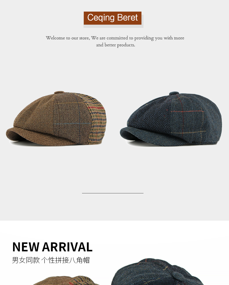 秋季新款八角帽男士鸭舌贝雷帽英伦复古人字纹针织报童帽画家帽潮