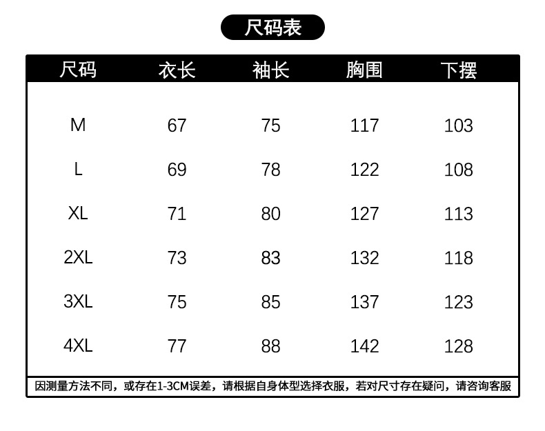 尺码 M 合适体重100-120斤,L 合适体重120-140斤,XL 合适体重140-160斤,2XL 合适体重160-180斤,3XL 合适体重180-200斤,4XL 合适体重200-220斤