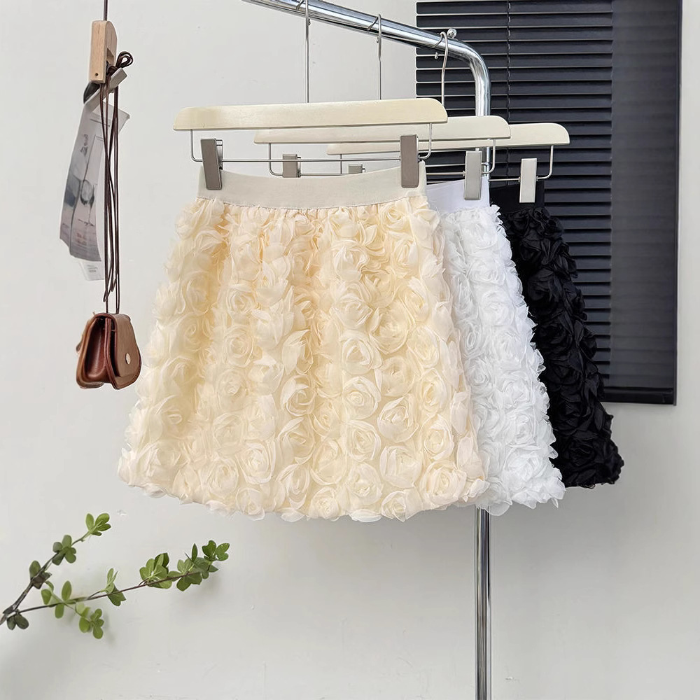 韓国風白ハイウエスト立体バラ装飾フェミニンショートスカート甘い年齢軽減Aラインヒップカバーショートスカート