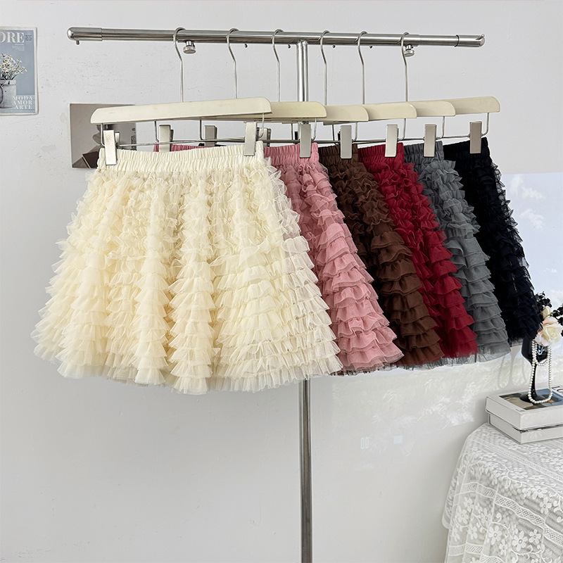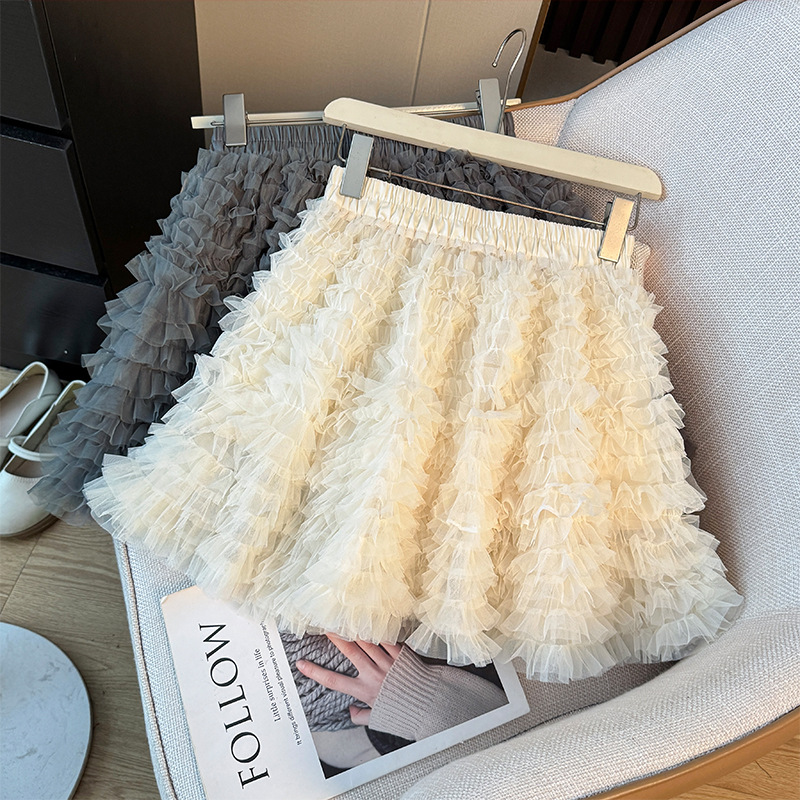韩系芭蕾风褶皱网纱蓬蓬半身裙女秋季2025高腰显瘦A字层层蛋糕裙