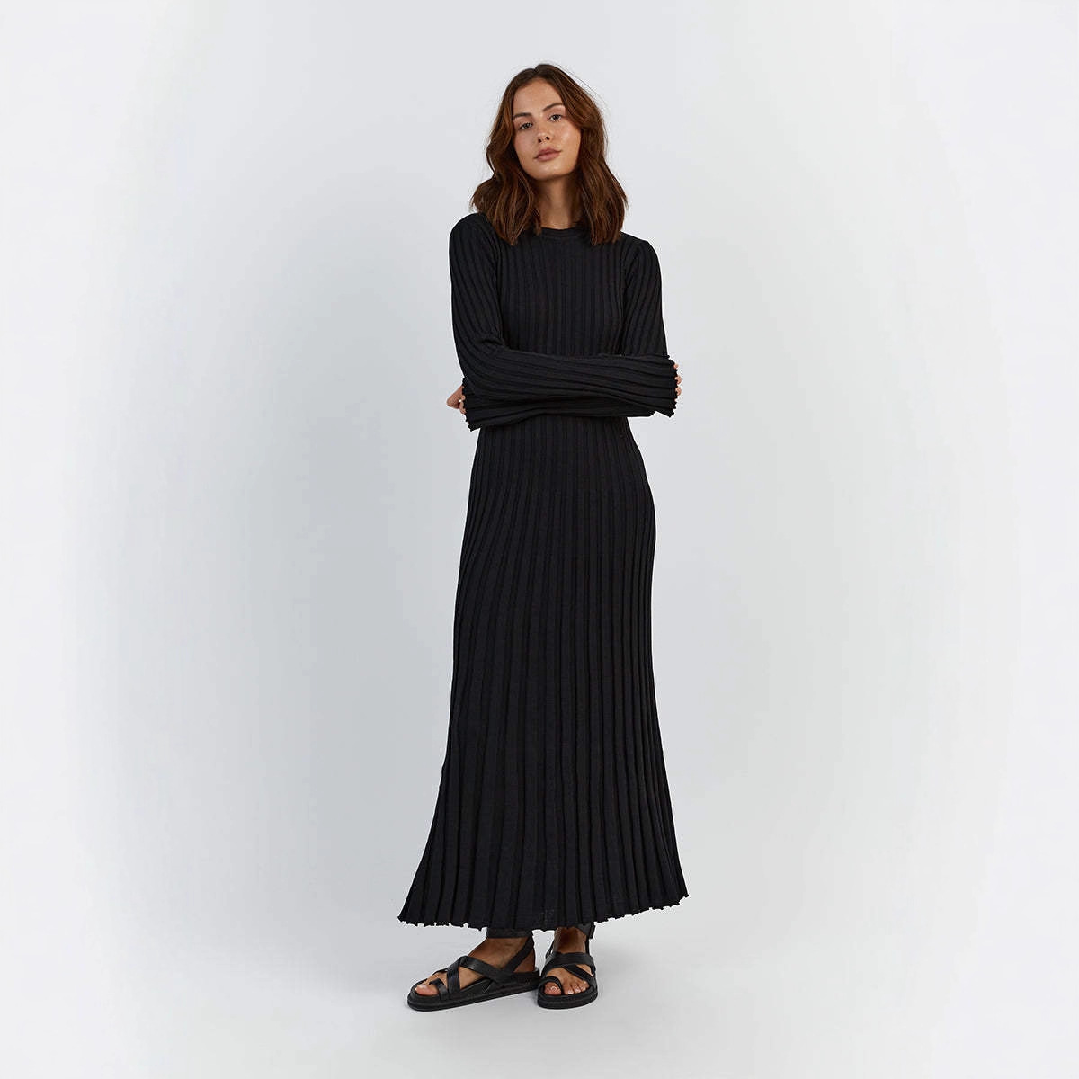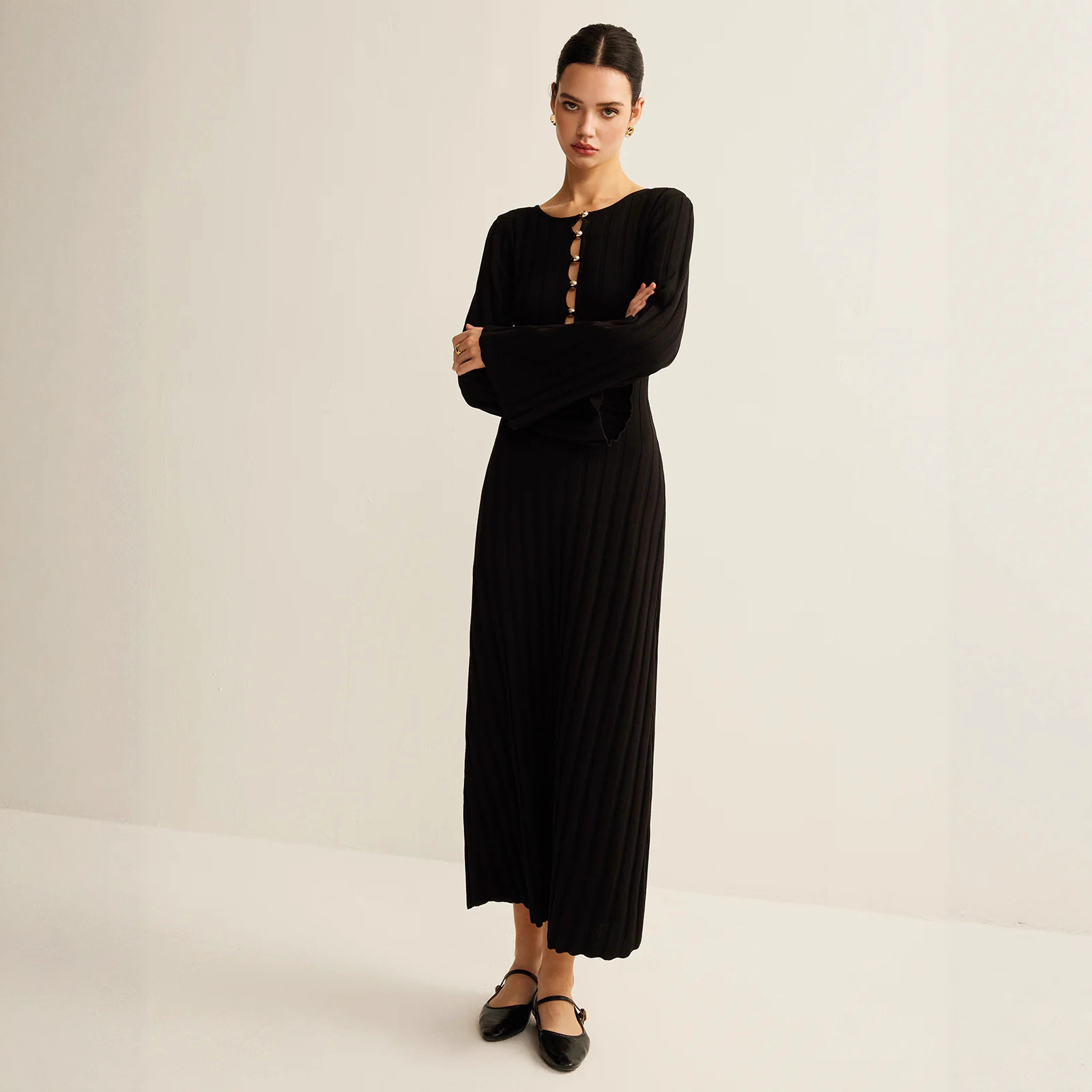 欧美新款跨境女装时尚优雅针织长裙毛衣裙度假风纯色打底连衣裙