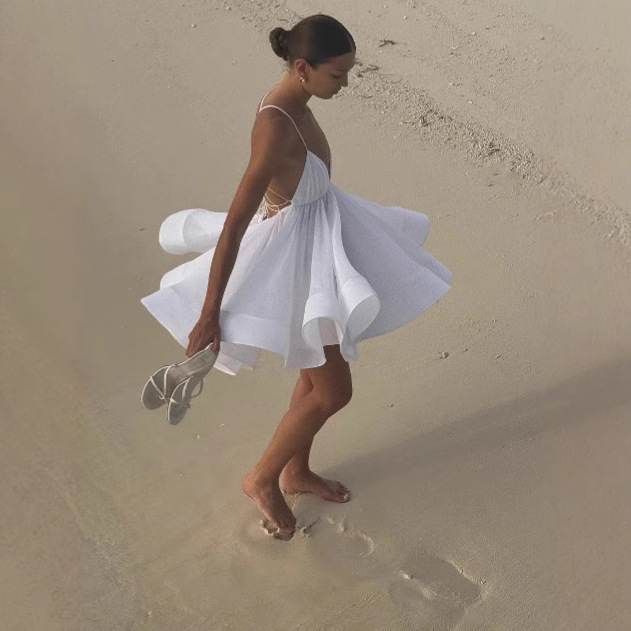 欧米風セクシーなレディース服、越境EC向けアマゾン新作、キャミソール、深いVネック、背中開き、プリーツ、パフスリーブワンピース、欧米スタイル