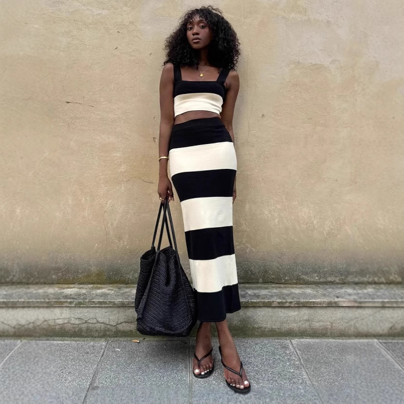 欧米中東の新型クロスボーダー婦人服白黒ニットストライプのロングタイプのスカートベストのストラップのセーターのロングスカート
