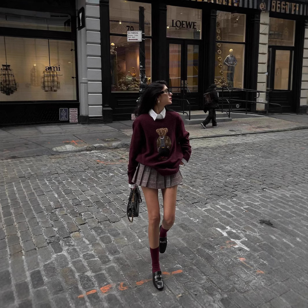 丸首の新作クロスボーダーレディース服、クマの刺繍入りレトロスリムフィットセーター、アメリカンカレッジスタイルニットトップス