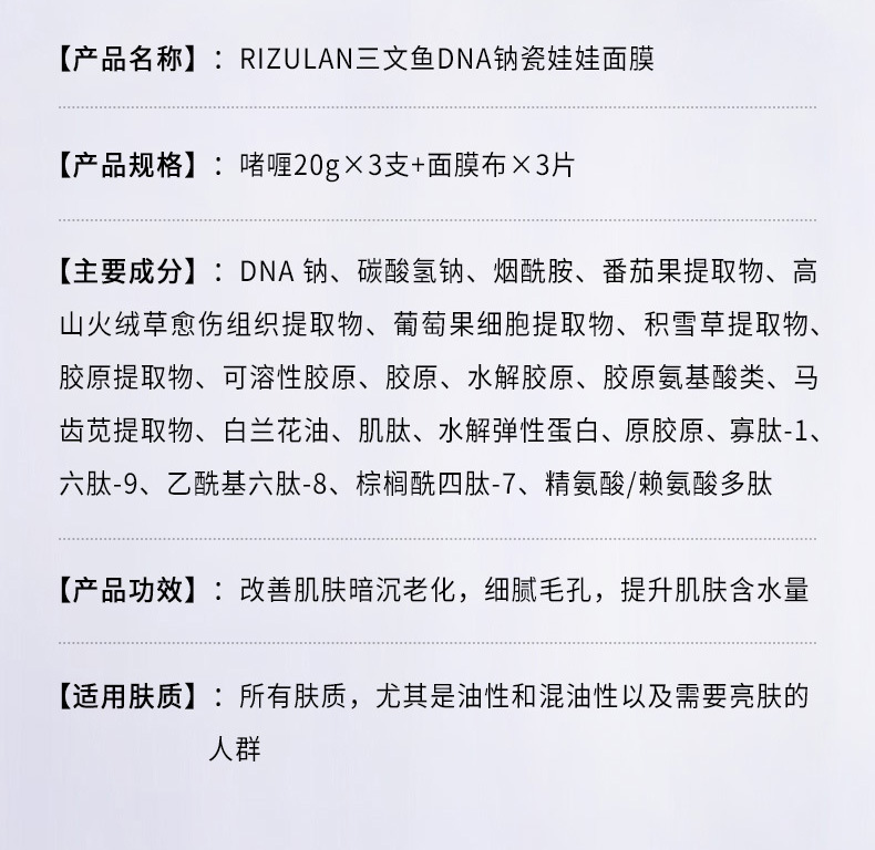 产品名称 RIZULAN三文鱼DNA钠瓷娃娃面膜
