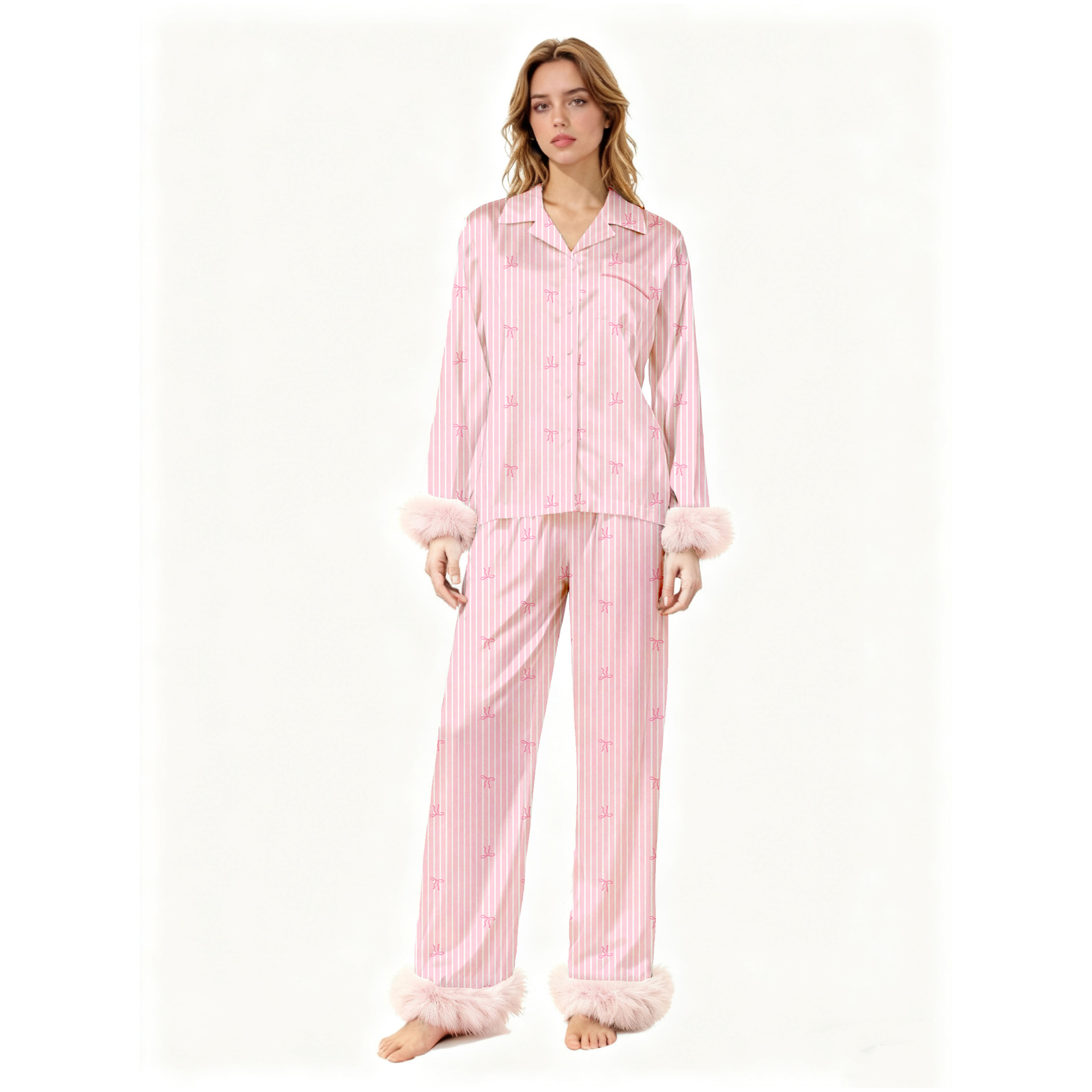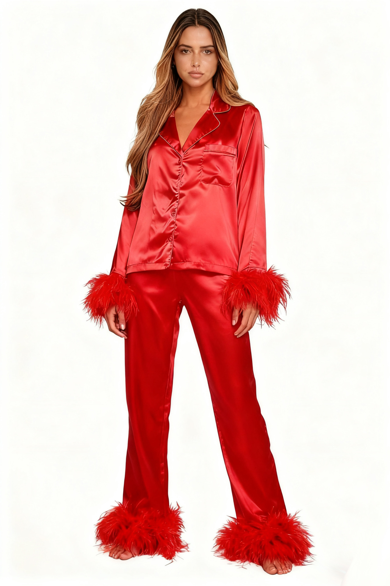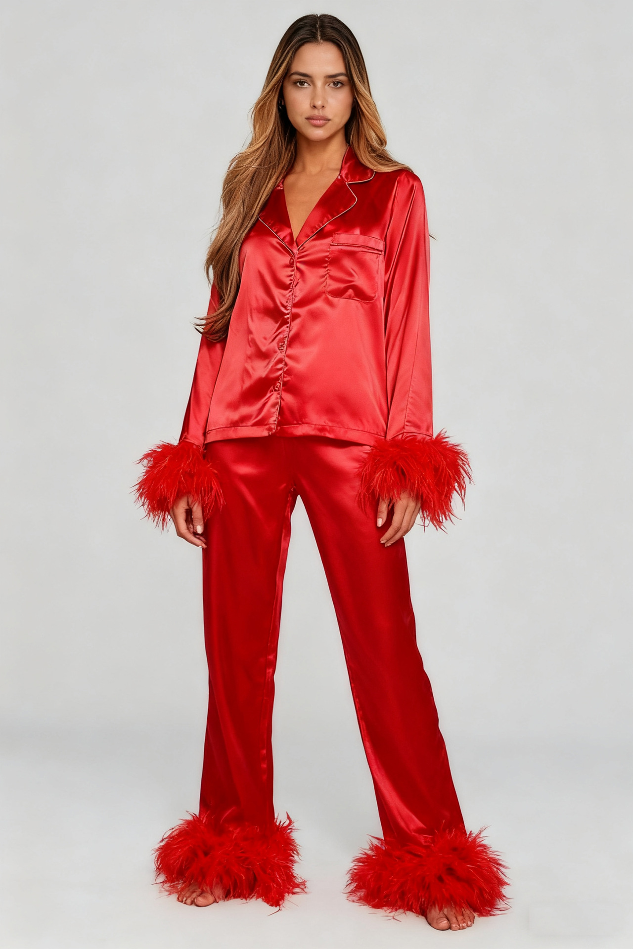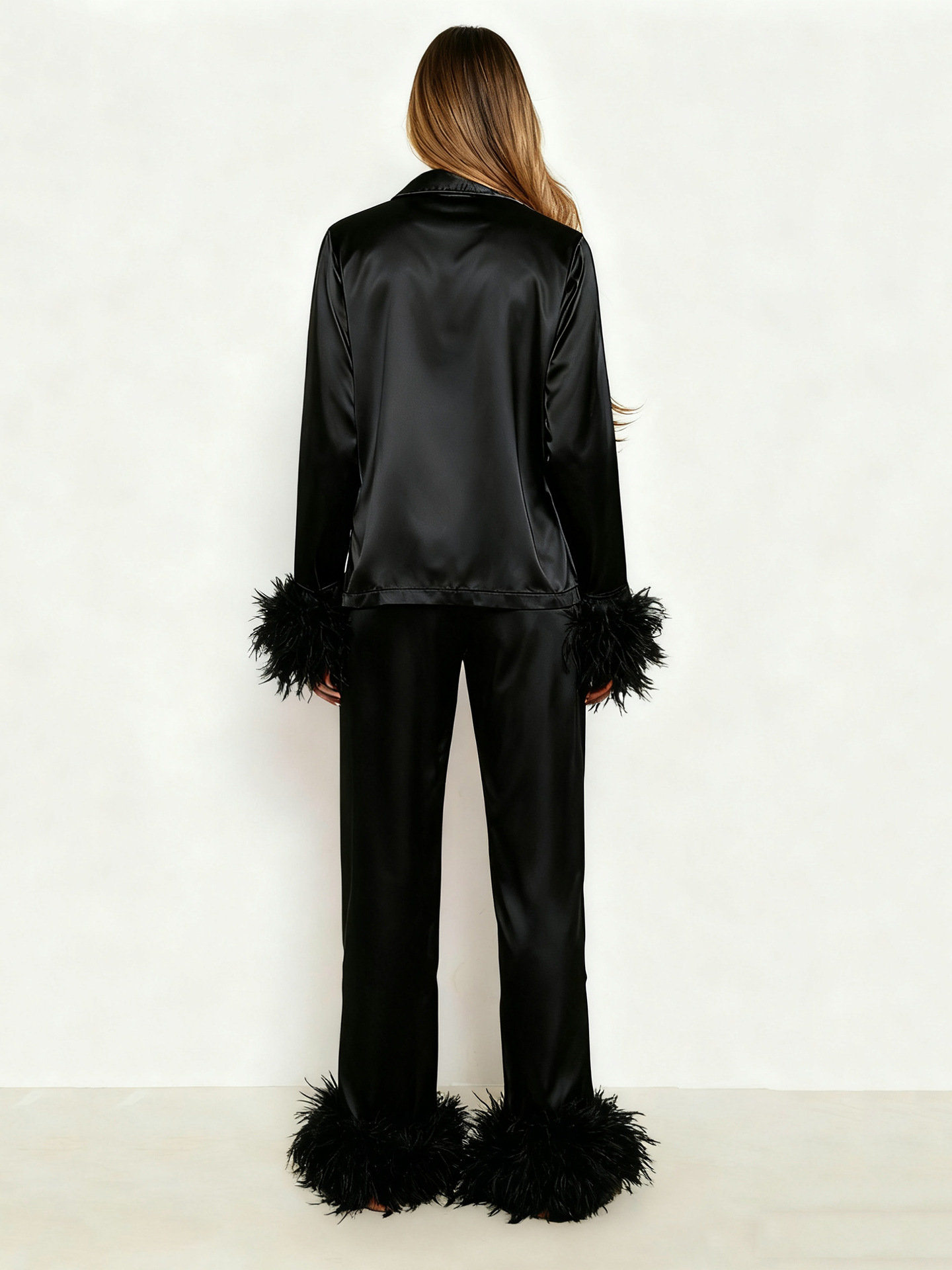 欧美 时尚ins鸵鸟毛羽毛睡衣套装2025色丁女士家居服长袖长裤套装