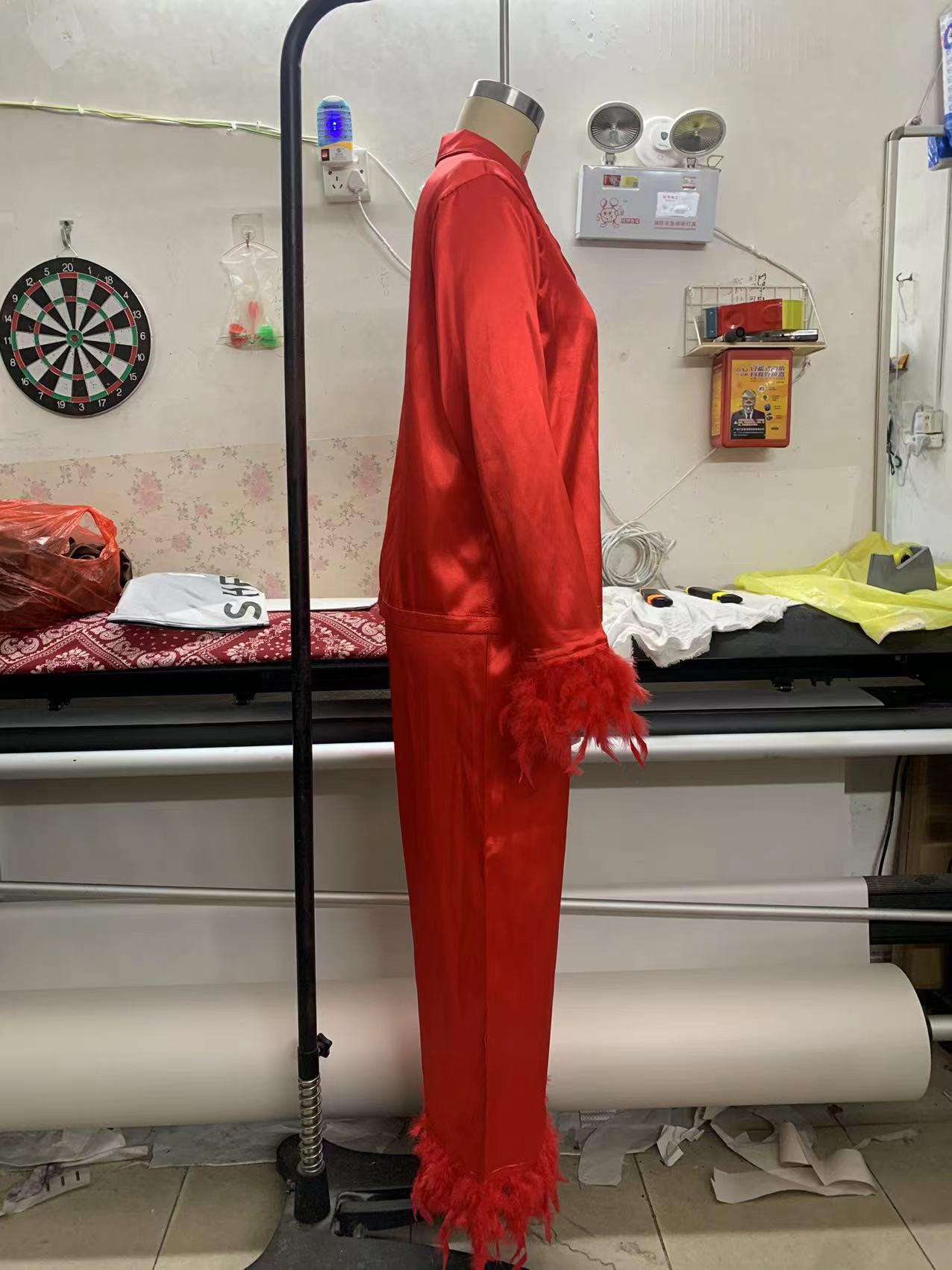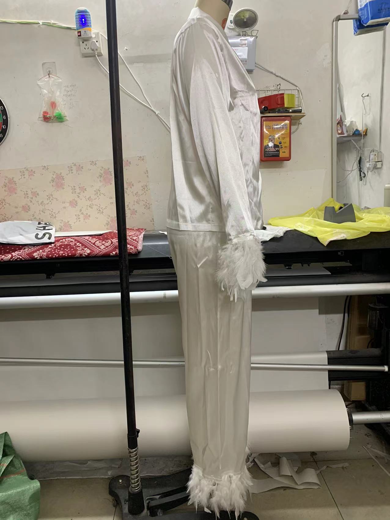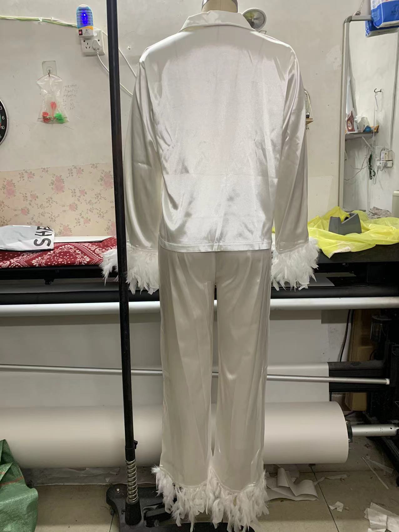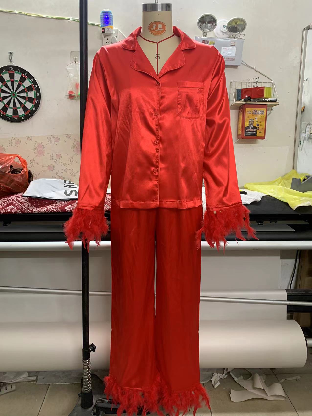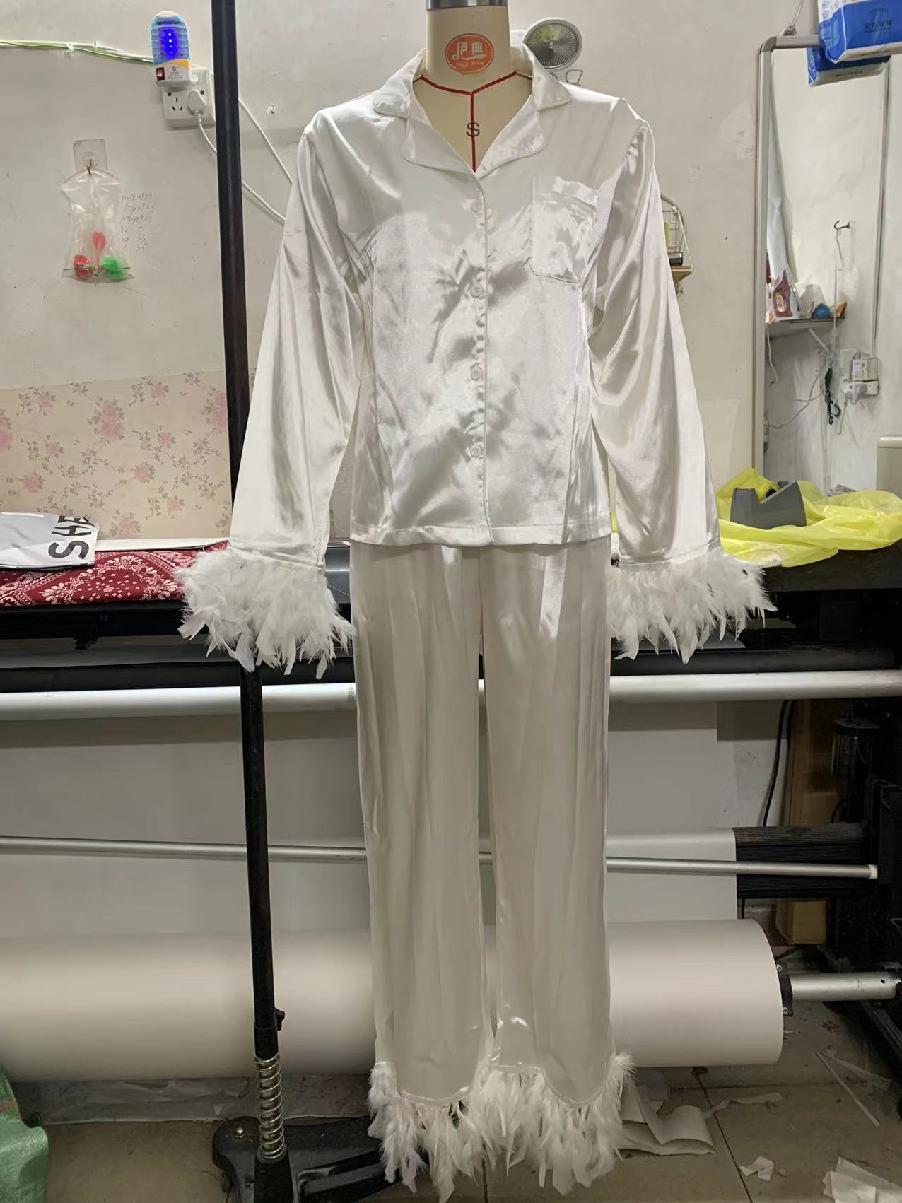 2025春季欧美冰丝睡衣时尚鸵鸟毛衬衣长裤宽松两件套羽毛家居服女