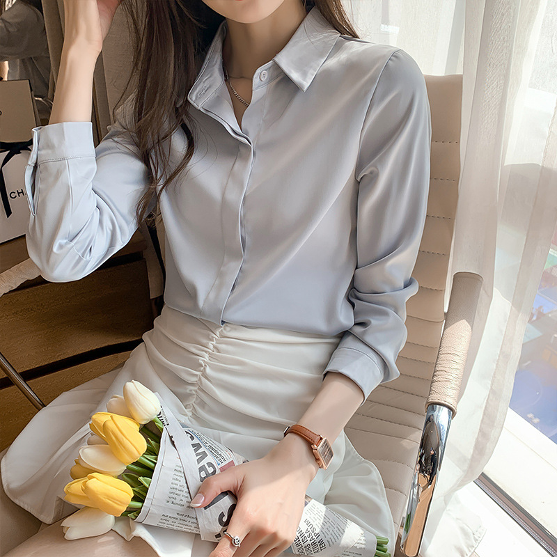8195おしゃれなレディース長袖シャツ、オフィスウェア、新作、上品で万能なアセテートサテンシャツ、女性用アウターウェア