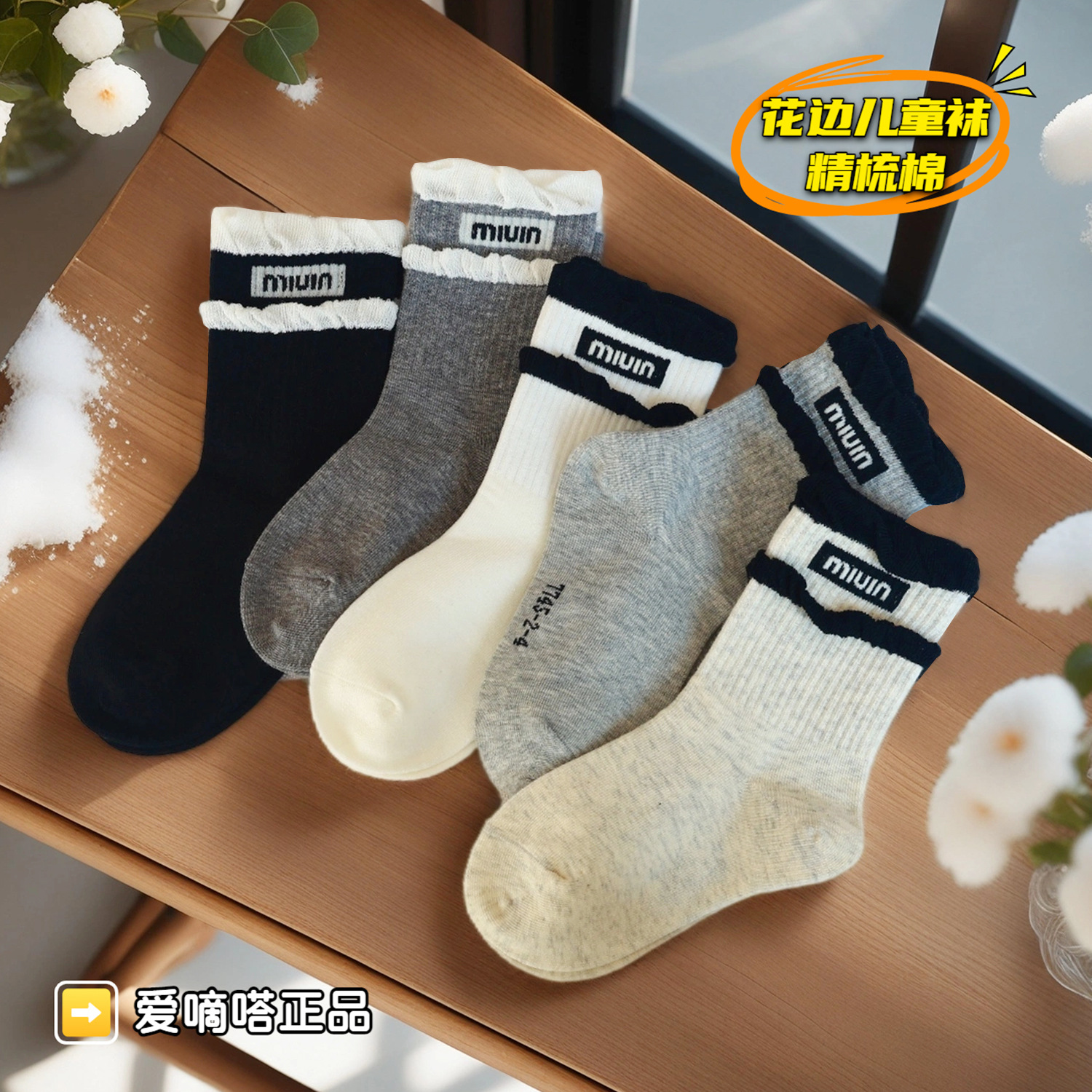 厂家批发爱嘀嗒儿童袜秋季新款中筒花边字母精梳棉韩版潮流学生袜