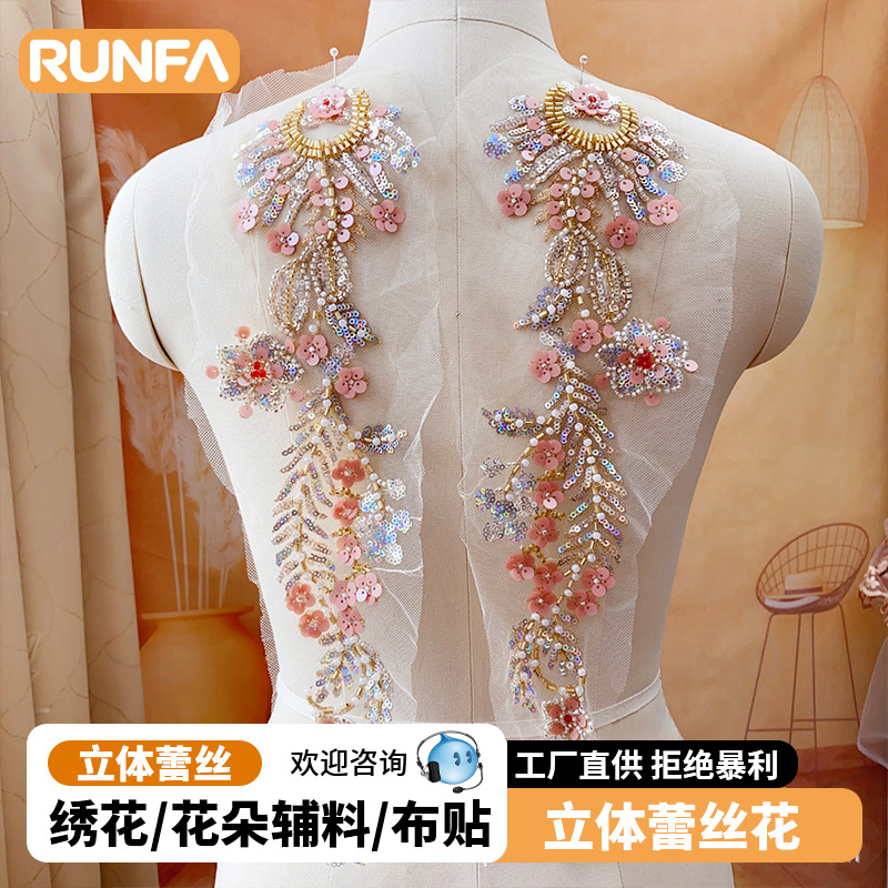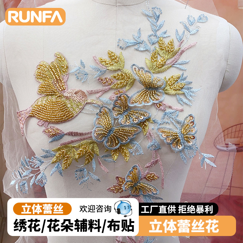 蝴蝶花朵辅料新款中国风马甲连衣裙装饰材料粉红蝴蝶珠绣蕾丝布贴
