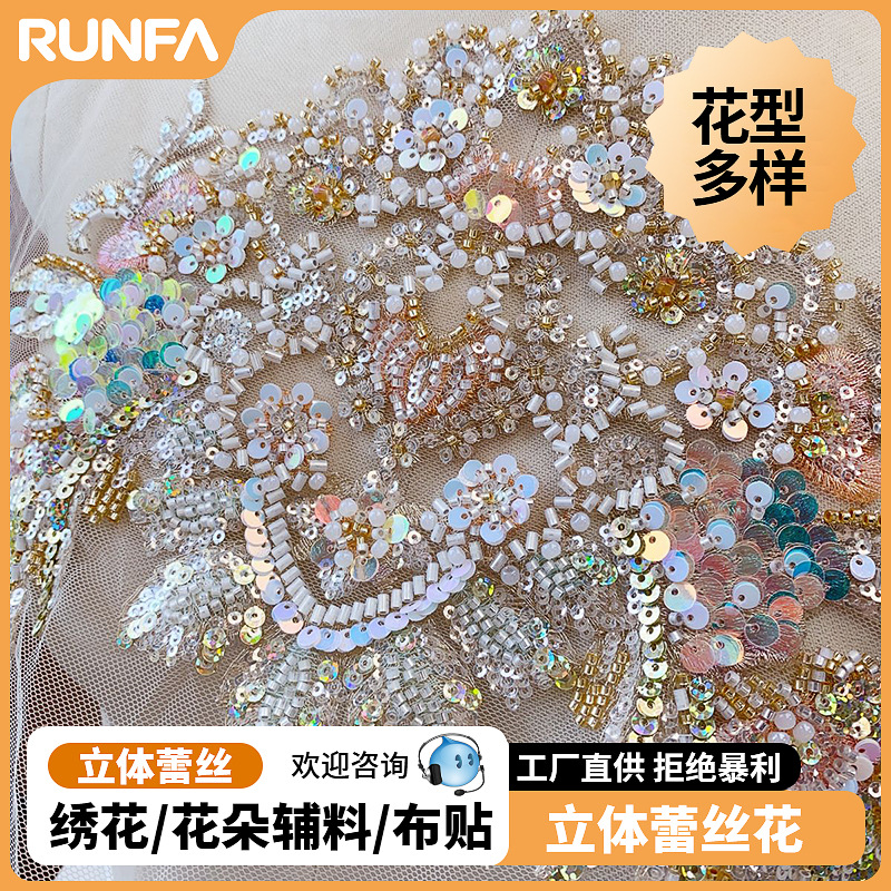 常熟潤发服飾 立体花飾り ビーズ刺繍 花嫁用ヘッドドレス 衣装アクセサリー 手袋 DIY フリル ビーズ刺繍