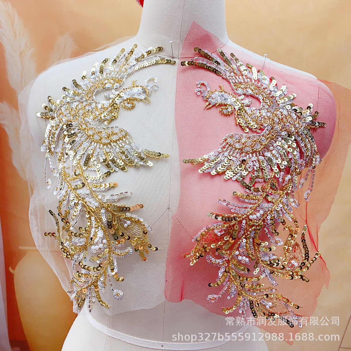 红色旗袍网底五彩亮片珠绣对花辅料婚纱晚礼服秀禾服辅料配饰花贴