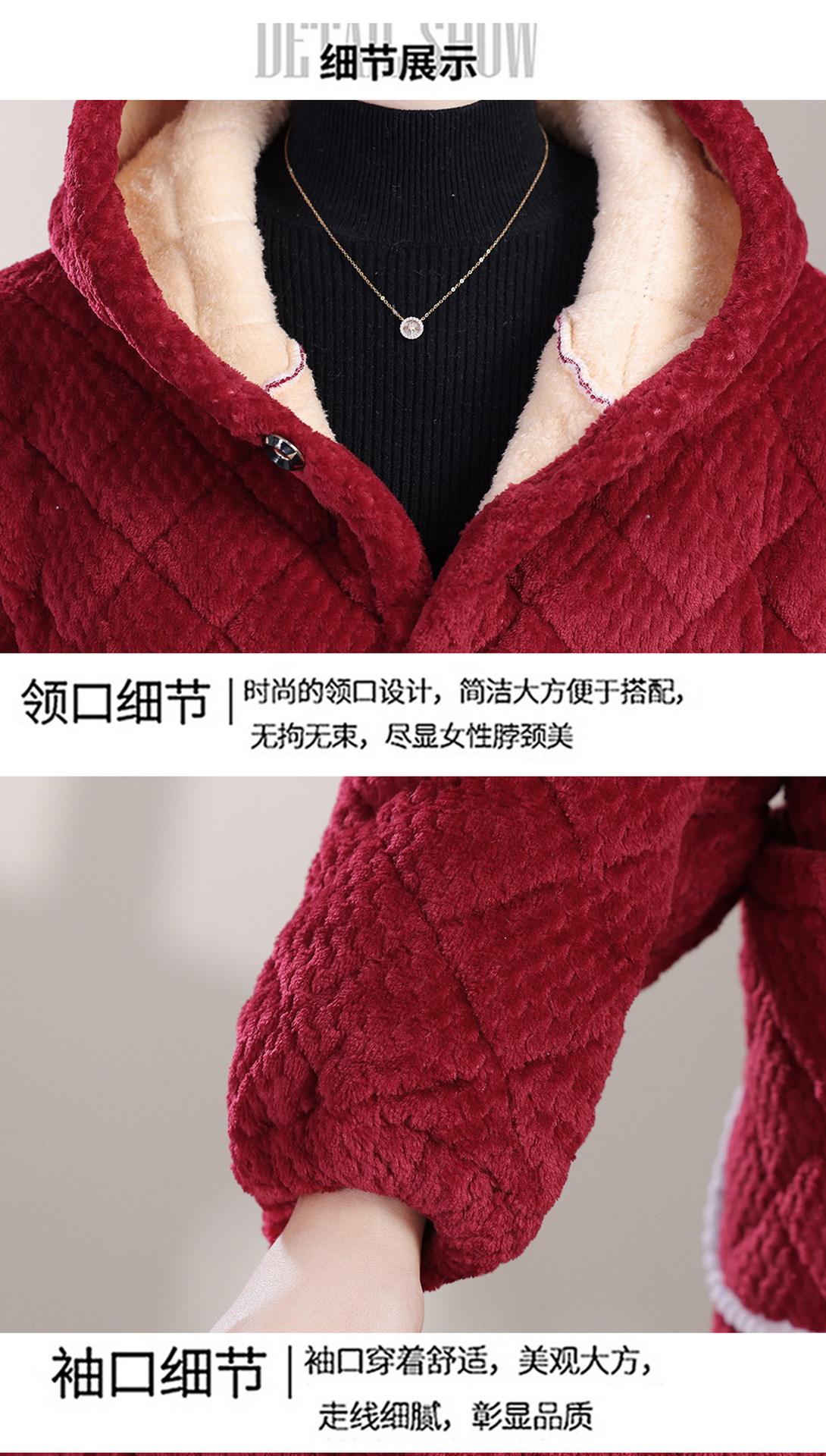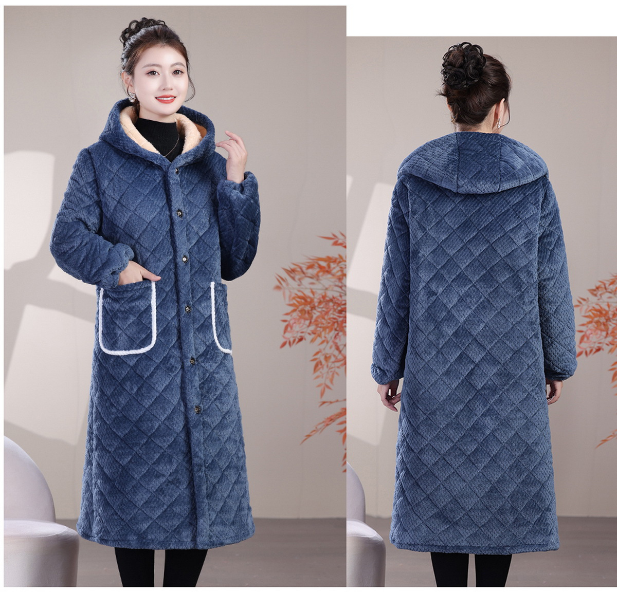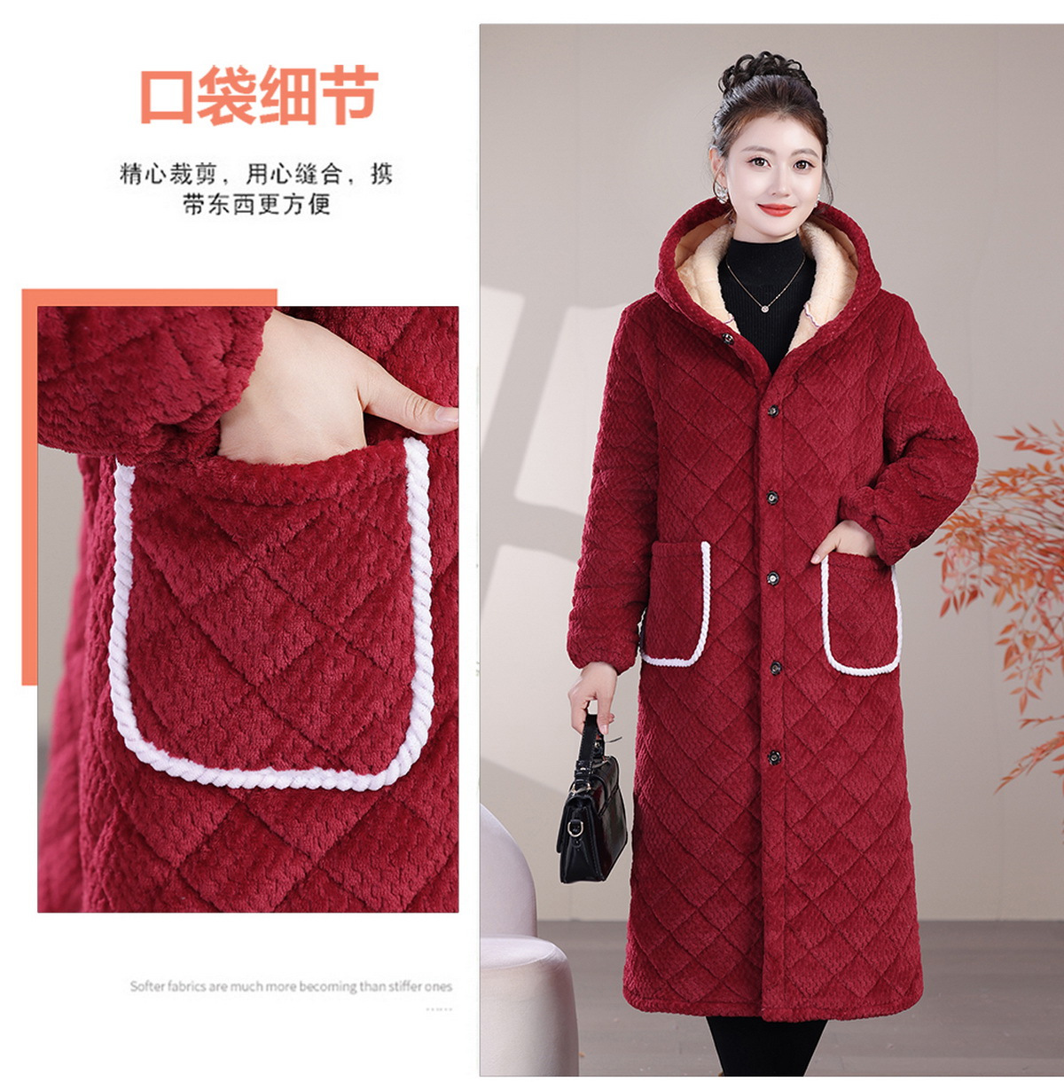 冬季新款法兰绒加绒加厚女装家居服三层夹棉保暖罩衣防寒棉衣外套