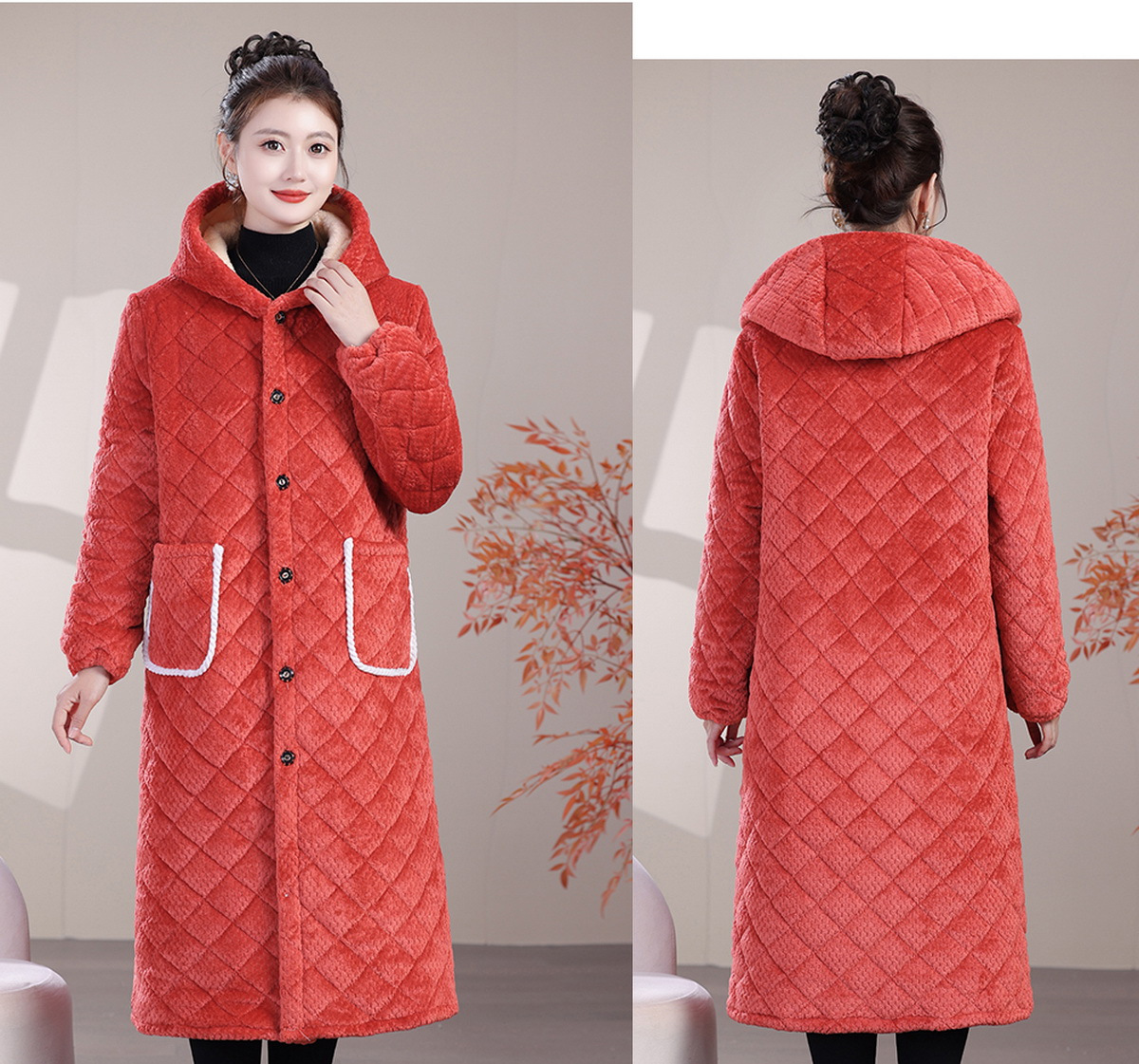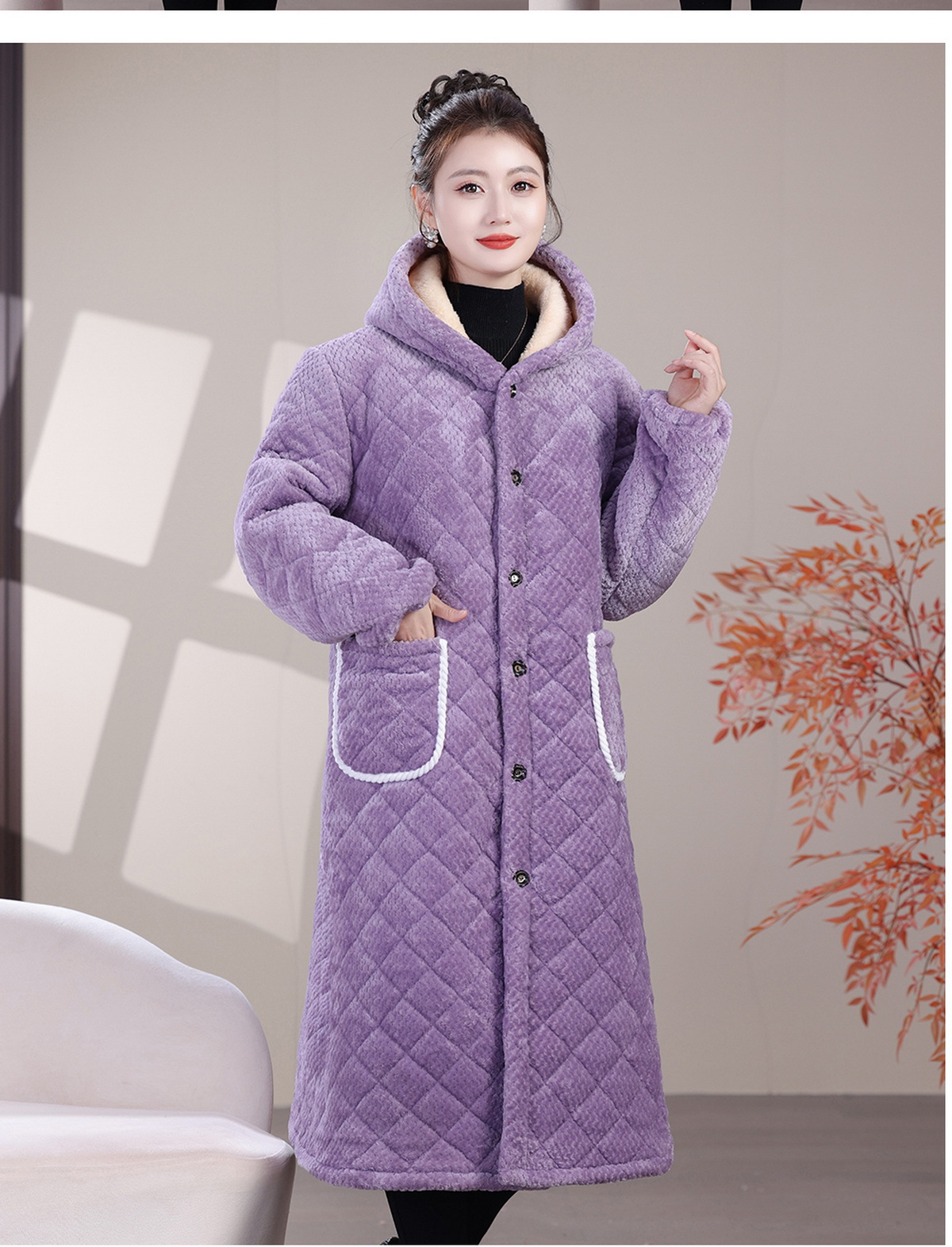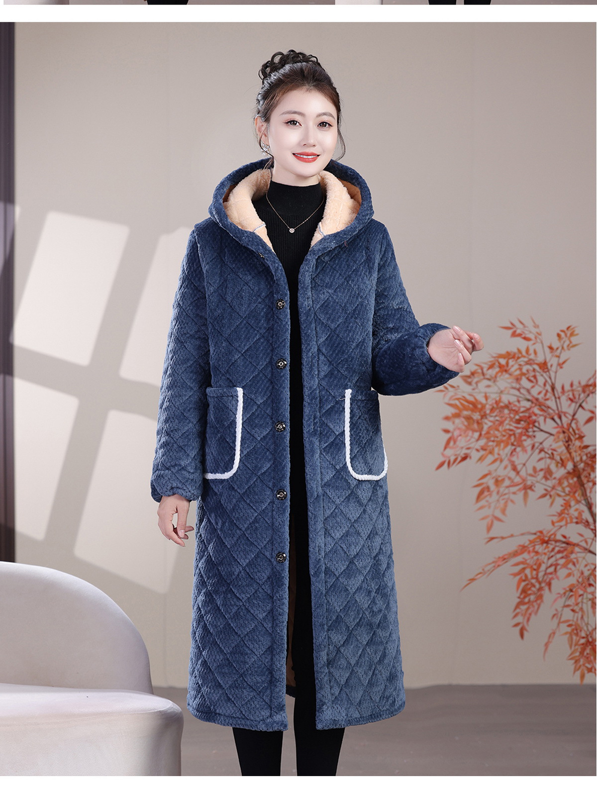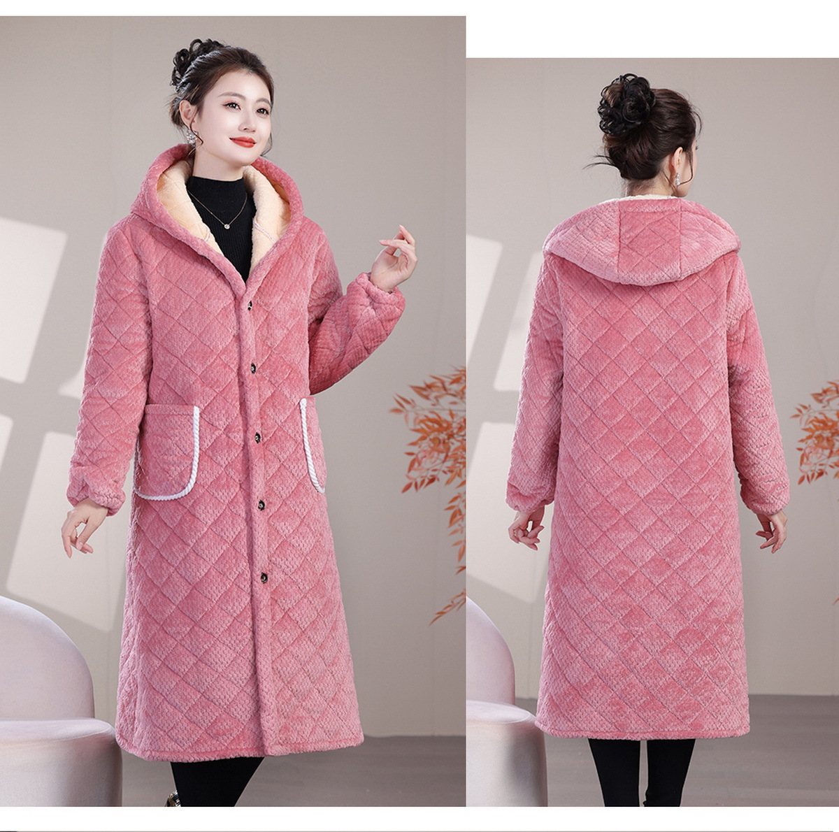 冬季新款法兰绒加绒加厚女装家居服三层夹棉保暖罩衣防寒棉衣外套