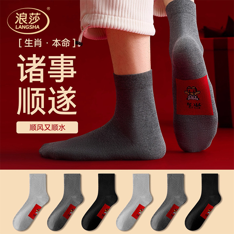 浪莎本命年袜子男马年新款踩地袜小人纯棉吸汗透气舒适中筒袜新年