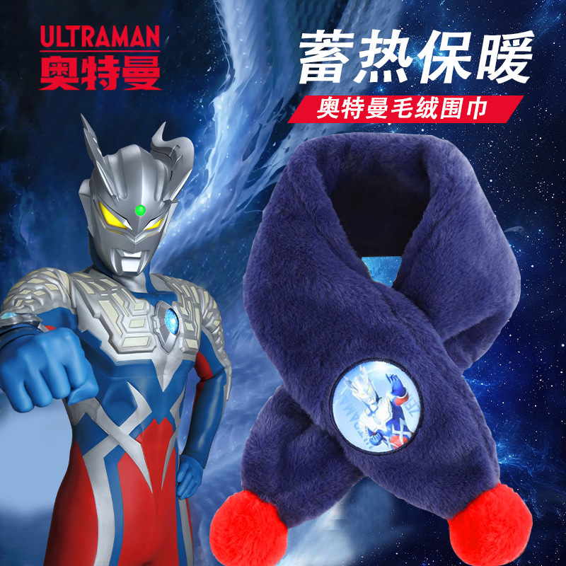 正版奥特曼儿童围巾可爱卡通拼色公仔男孩冬季毛绒保暖加绒围脖