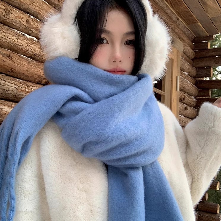 韩系氛围感克莱因蓝色围巾女冬季加厚保暖纯色防寒马海毛围脖批发