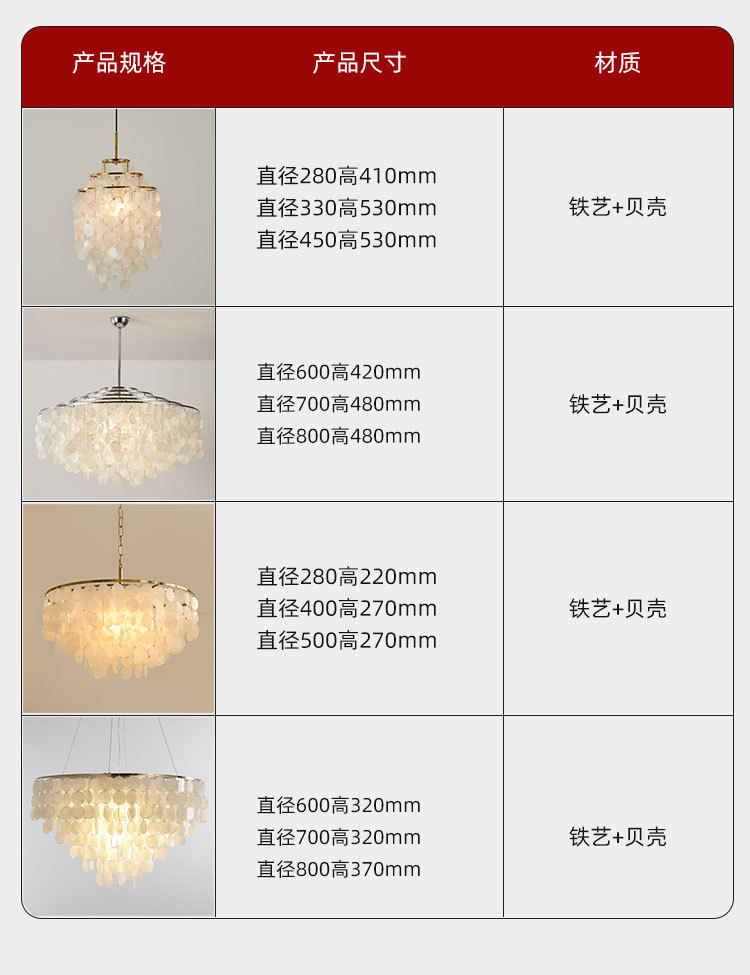 天然贝壳客厅灯餐厅卧室灯意大利设计师北欧法式奶油风铃吊灯跨境