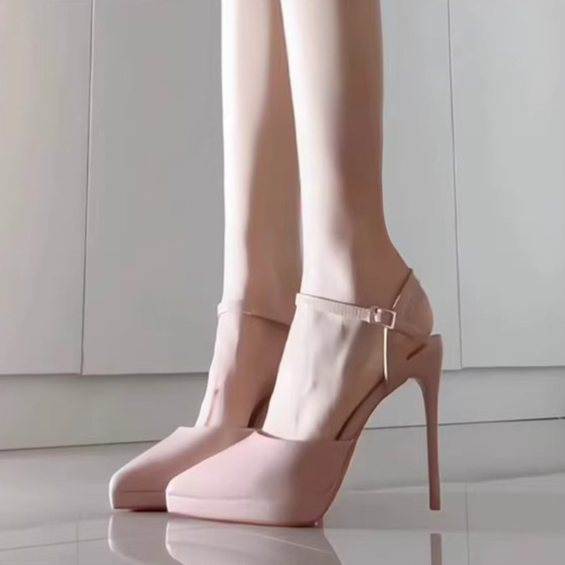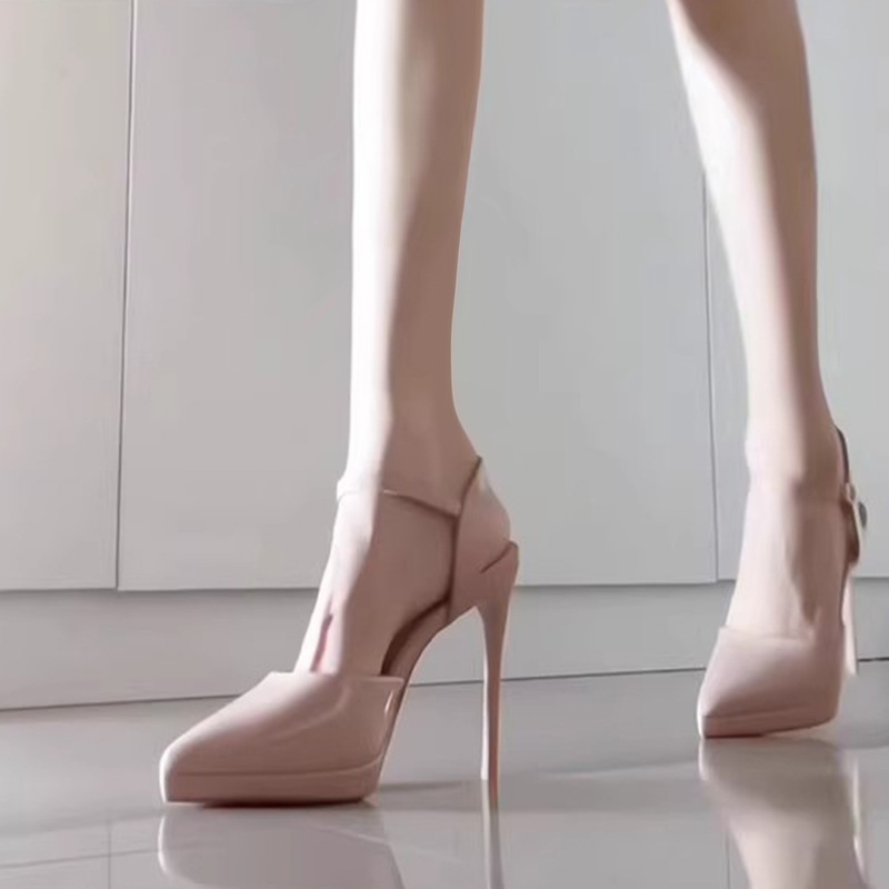法式名媛裸粉色细跟包头凉鞋女气质尖头一字带中空高跟鞋防水台女