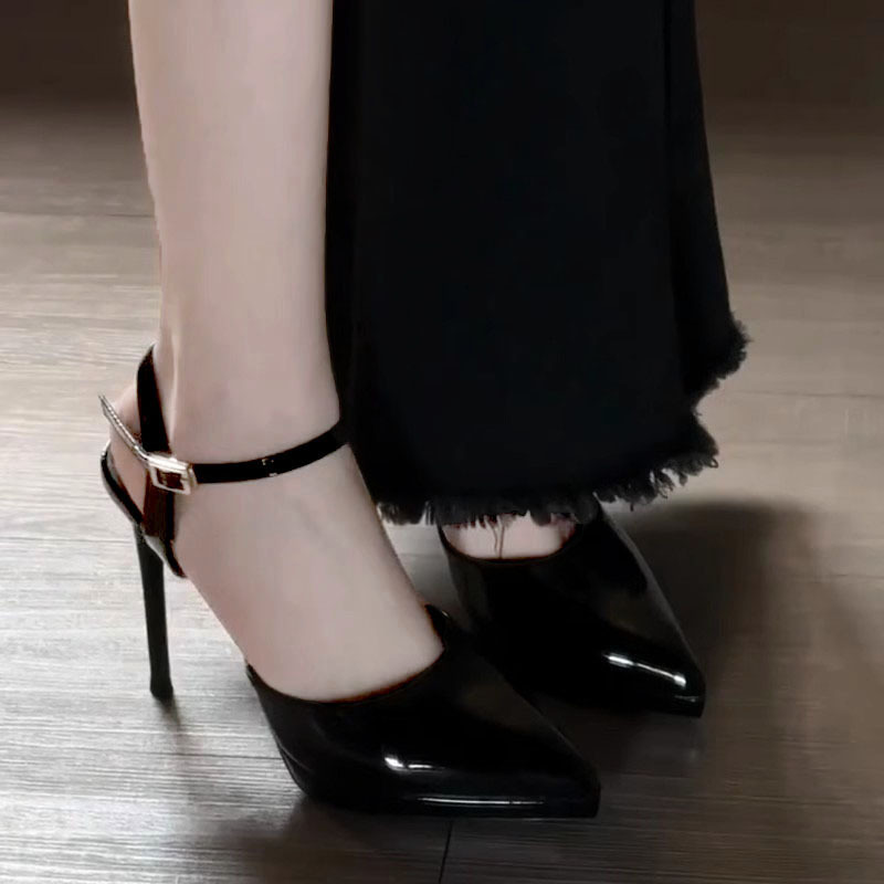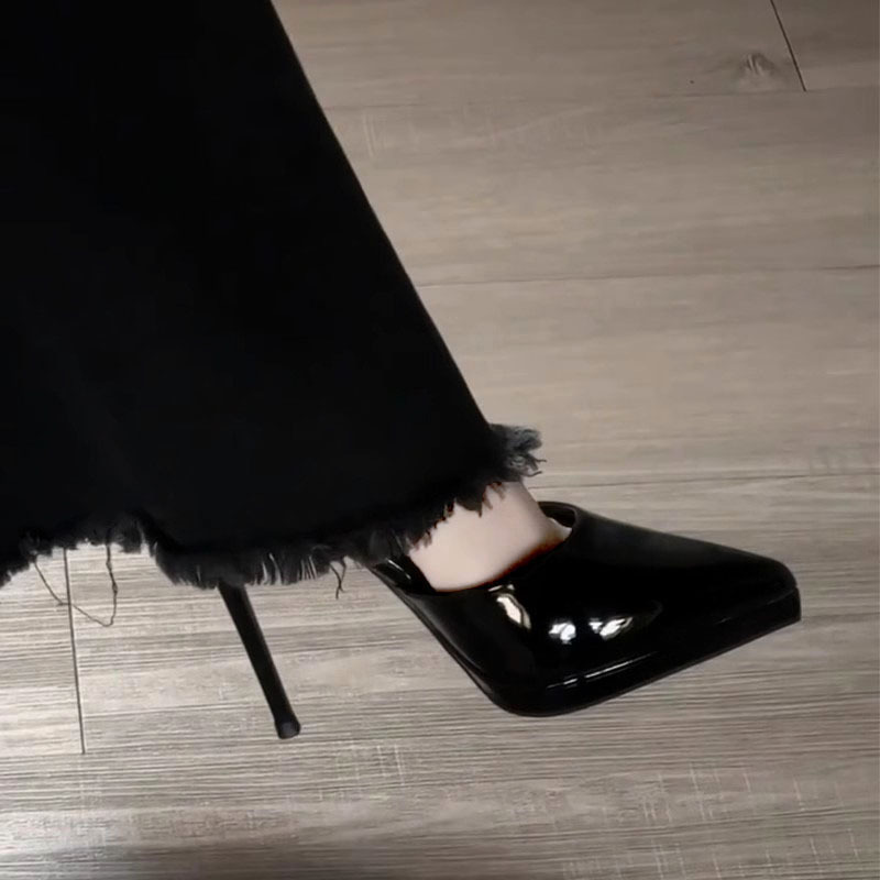2025年新作 ブラックパテントレザー シンプルセクシー 浅口 パブリックファッション レディースシューズ ブラックレッドインナー ハイヒール